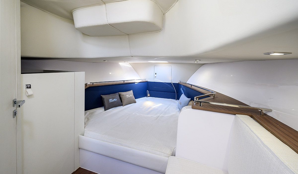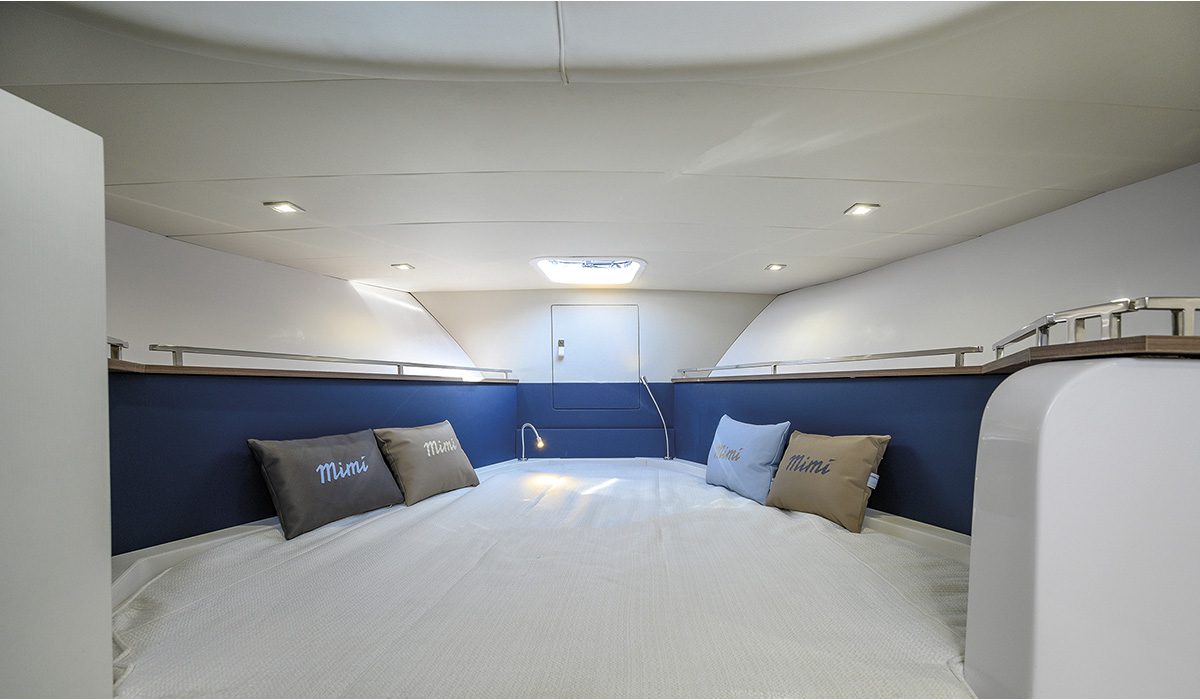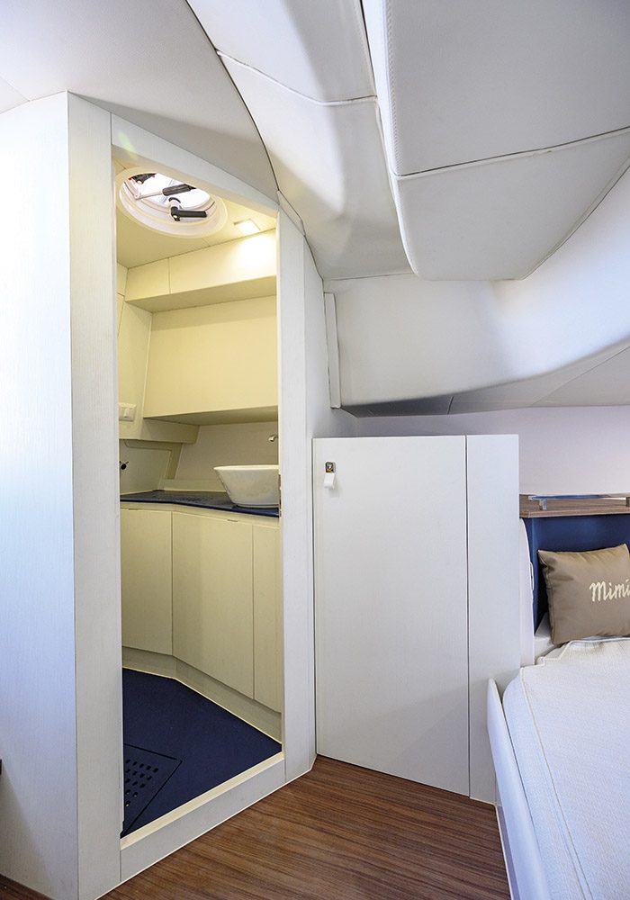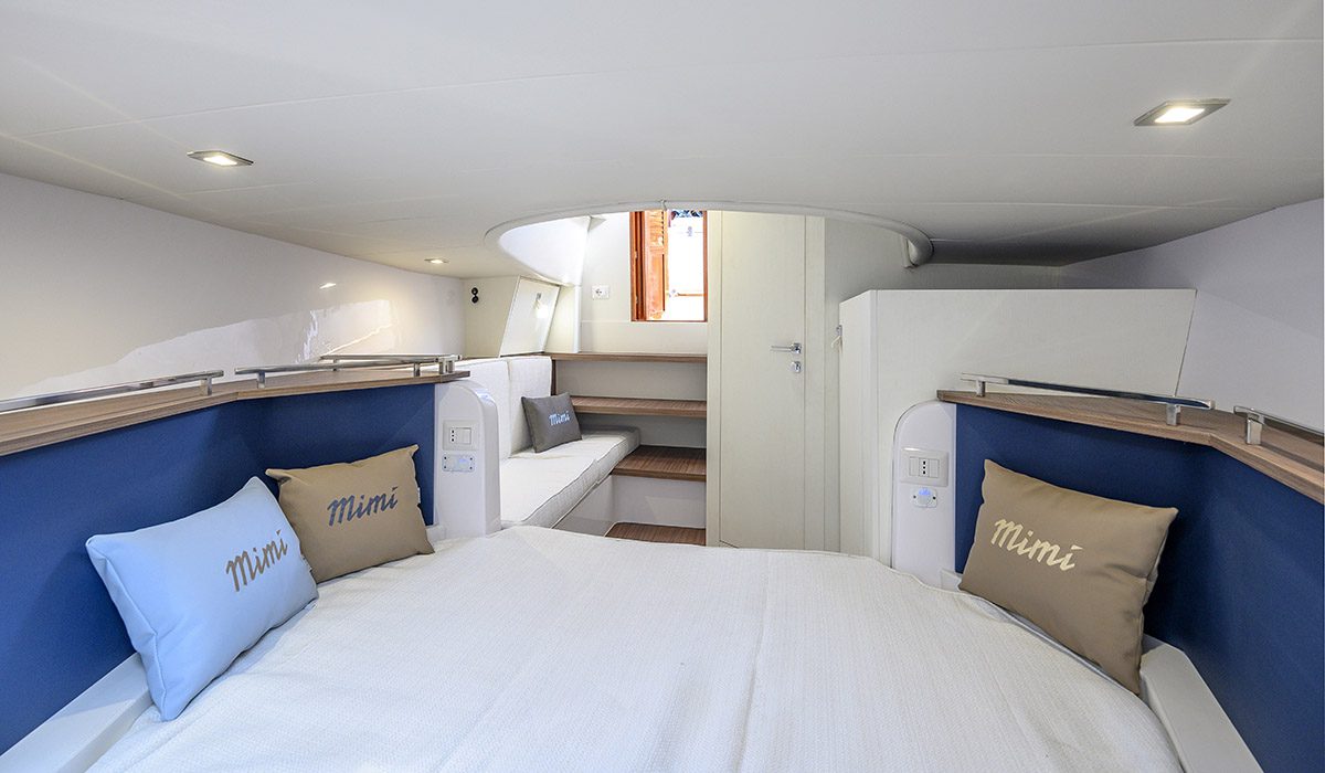 Ben proporzionato è pure il divano semicircolare che, abbassando il tavolo su colonna (sufficiente per sei persone), si trasforma in un ampio prendisole che va così ad aggiungersi a quello fisso, posto a proravia della console. Questa, protetta da un hard-top che si estende fino a coprire il monoblocco cucina centrale, dotato di lavandino, fornello a due fuochi e vano frigo, ospita sulla sinistra il pannello strumenti e la timoneria, e sulla dritta il portello di accesso alla cabina. Sottocoperta, il Libeccio 9.5 WA offre tutto quel che serve per il weekend di una coppia, disponendo di un ampio cuccettone matrimoniale a tutto baglio, di un divanetto, di una toilette separata e, cosa da non sottovalutare, di capienti volumi di stivaggio.
