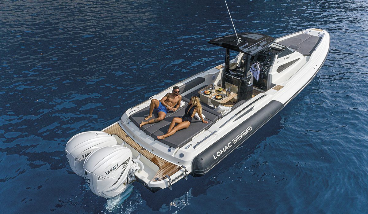Alle spalle del divano, coperto da due prendisole separati, si apre un grande gavone per lo stivaggio di ogni sorta di attrezzatura e bagaglio o che in alternativa può, volendo scegliere una motorizzazione diversa, ospitare due entrofuoribordo. Nell’insieme, tanta abitabilità anche all’esterno nel gradevole e armonioso stile Lomac.
