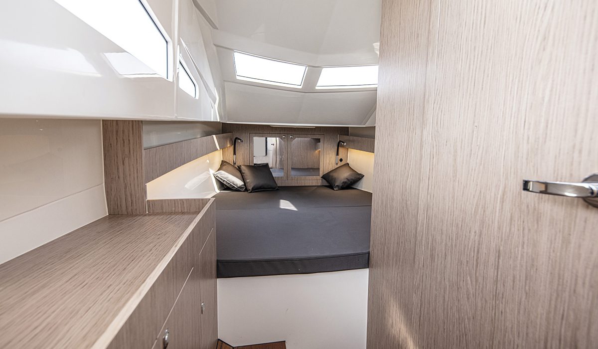 Se le sezioni di poppa sono identiche al GT12, che rimane in produzione, è a prua che ci troviamo di fronte all’innovazione più significativa. Tutta la zona è stata pontata, permettendo di realizzare un grande prendisole e, soprattutto, una cabina matrimoniale con bagno separato, ottenendo un incremento del 30{2e3577d2bd6aebaa150c85c33fcd353783f1aa6c690283591e00ef60b3336fc8} di spazio disponibile.