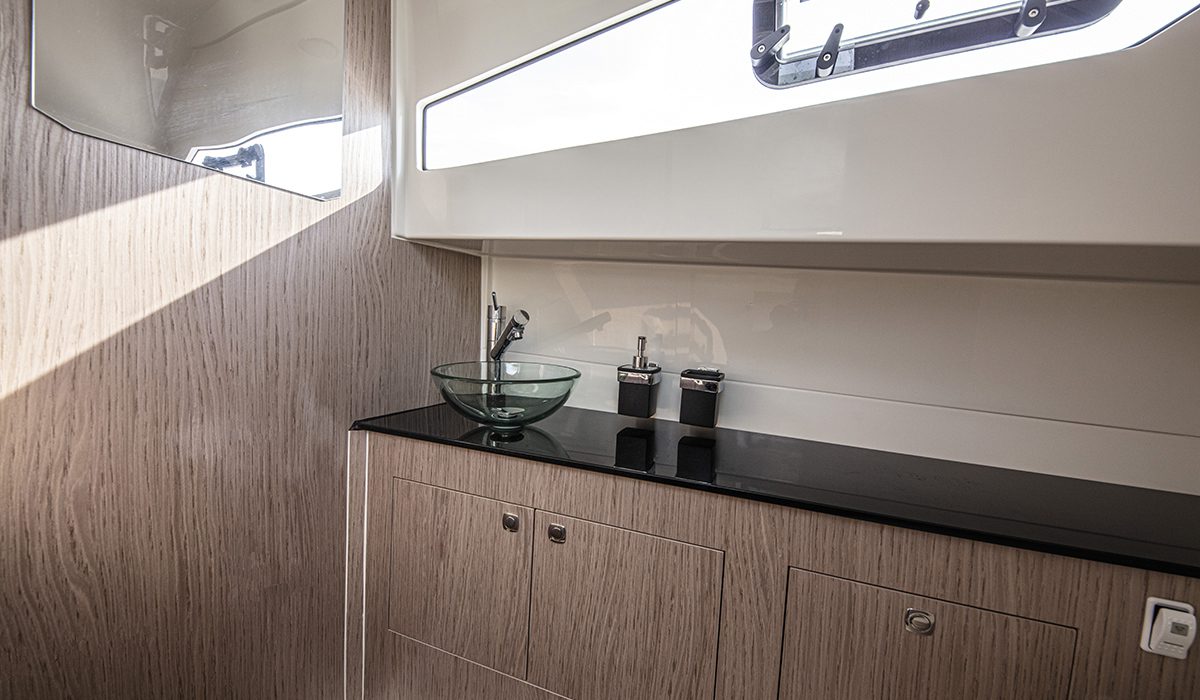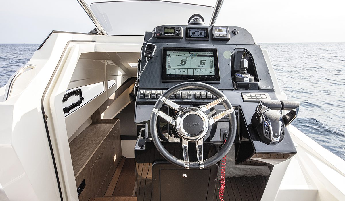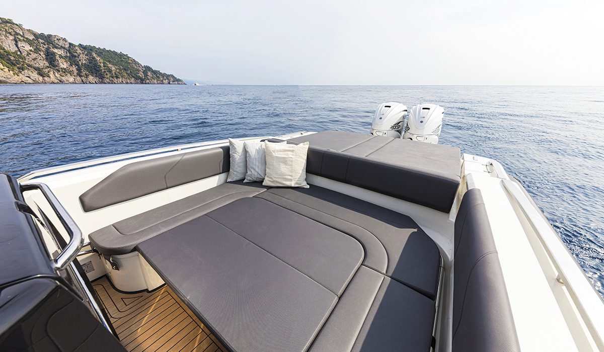 Ben concepita la plancia di comando – con una bella e comoda pedana per puntare i piedi, le manette rialzate rispetto al piano degli strumenti e il joystick per le manovre in porto – alle spalle della quale c’è il classico mobile con frigo e lavello. Molto flessibile l’utilizzo del pozzetto grazie al piano di calpestio che può essere alzato a livello del divano, in modo da configurare un secondo solarium, oppure sollevato ulteriormente, per trasformarlo in tavolo da pranzo.