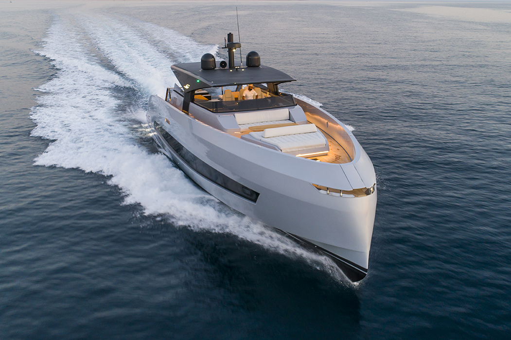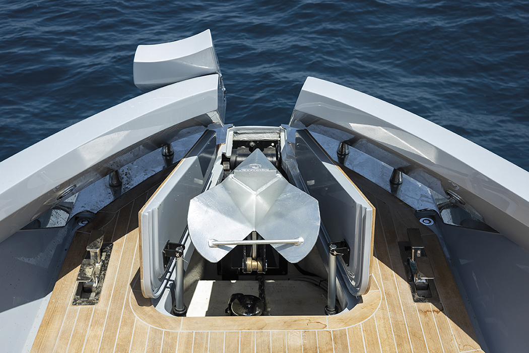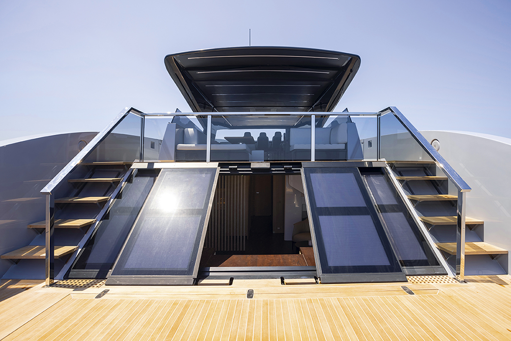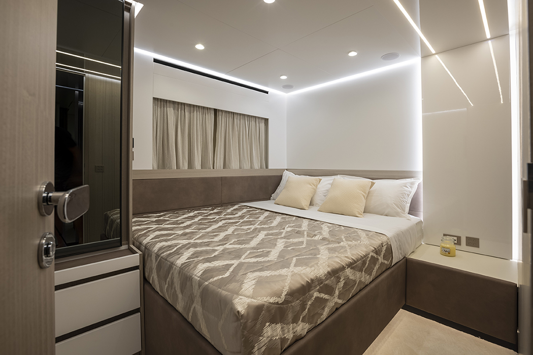 In questo caso, dunque, la zona giorno è tutta nella parte posteriore, con una porta a quattro ante – le due centrali apribili – che rende il passaggio interno/esterno particolarmente comodo. Un secondo layout prevede a poppa la cabina armatoriale, offrendo così al proprietario la sua terrazza privata sul mare, mentre la cabina di prua a tutto baglio diventa una Vip. E che Vip! Con ulteriori opzioni si possono avere quattro cabine e la cucina sul livello superiore oppure tre cabine con la cucina e una dinette in quello inferiore.