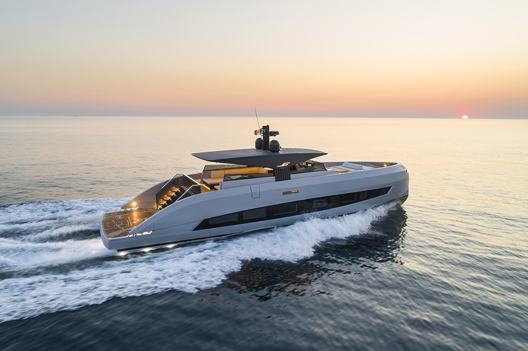 I colpi di design del progettista si sono concentrati nella bella prua verticale, nell’impavesata alta che offre alla soluzione walkaround una sicurezza a prova di bambini, nelle lunghe finestrature a scafo ogivali che tagliano senza soluzione di continuità le murate per illuminare il ponte inferiore e nella spettacolare porta scorrevole che separa la plancetta – o spiaggetta che dir si voglia – di ben 20 mq abbondanti dall’area interna.