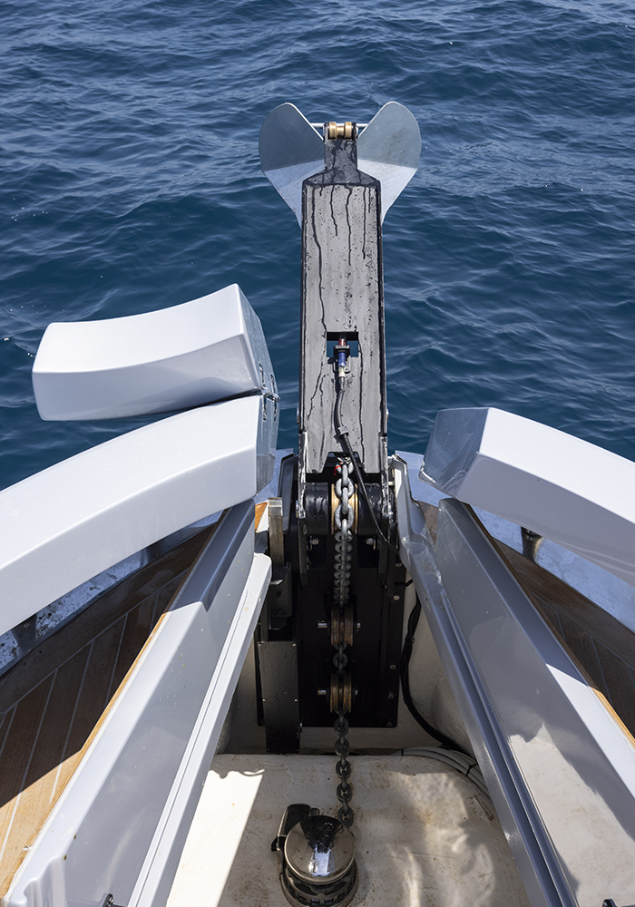 Materiali: scafo e coperta in vetroresina, sovrastruttura top in carbonio – Tipo di stratificazione: manuale per scafo e coperta, infusione sottovuoto per top – Geometria della carena: a V variabile (deadrise 19,5 gradi a poppa) – Piani mobili: interceptor Humphree – Stabilizzatori: pinne Humphree interfacciate con interceptor – Attrezzature di prua: salpancora con braccio ancora pivotante a scomparsa custom Besenzoni e salpancora Quick. – Attrezzature di poppa: 2 winch tonneggio Sanguineti a scomparsa – Plancetta poppiera: fissa con Transformer Opacmare.