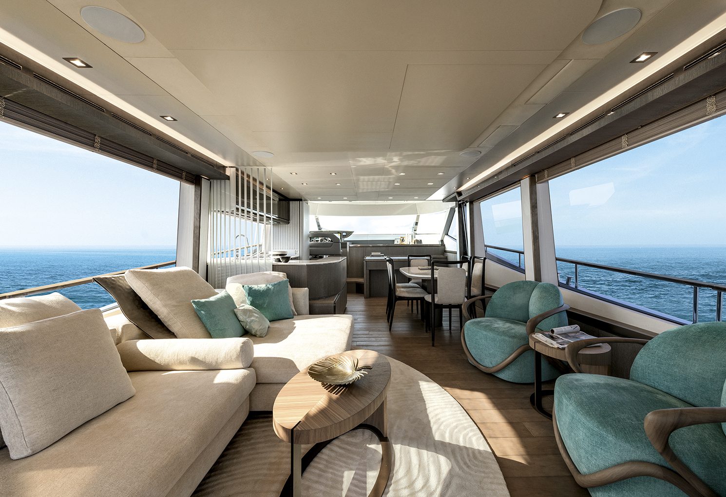Il nome – MCY 76 – è lo stesso del modello che nel 2010 fece la sua comparsa in anteprima mondiale a Venezia. Dopodichè, qualsiasi altra similitudine la si può cercare solo nella qualità della progettazione, dell’ingegnerizzazione e dei processi costruttivi. Ci troviamo infatti di fronte a un’idea profondamente diversa: quella che presiede alla costituzione della nuova serie Vision di Monte Carlo Yachts. Dunque eleganza, design ricercato ma allo stesso tempo funzionale, ottime qualità marine dovute a una carena che garantisce una navigazione fluida e confortevole sia in assetto dislocante – laddove si coniugano velocità di tutto riposo e un’eccellente autonomia – sia in assetto planante.