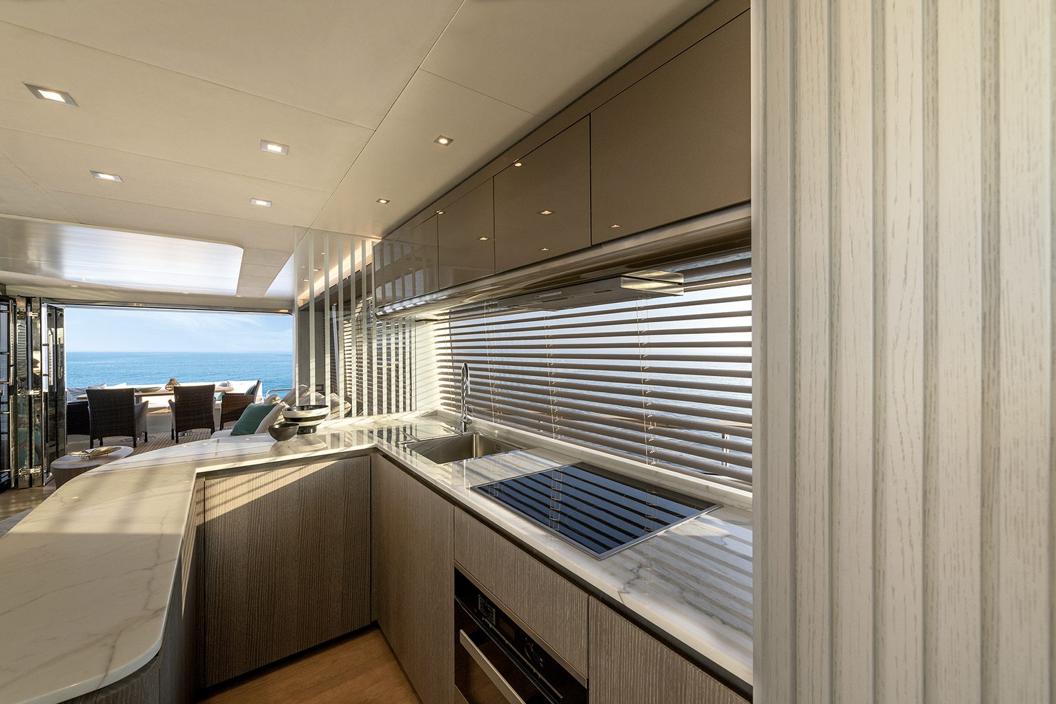 Seguendo la logica degli spazi funzionali, anche la vita all’aperto può essere condotta scegliendo tra ambienti diversi per modalità d’uso ma ben collegati tra loro attraverso percorsi fluidi e armoniosi. E’ il caso del pozzetto, collegato con la plancia di poppa sommergibile mediante due comode scale laterali simmetriche, con il solarium di prua attraverso ampi passavanti che confluiscono in un elegante ponte portoghese e, infine, con il flying-bridge tramite una scala molto ben protetta, posta sul lato dritto. A proposito del ponte superiore, va riconosciuto che i designer sono riusciti a creare una precisa articolazione dell’ampia superficie disponibile, senza generare alcun senso di affollamento. Perciò solarium, cucina/bar, zona pranzo e plancia di comando si integrano armonicamente su un’ampia superficie per gran parte protetta da un raffinato top a forma di visiera in fibra di carbonio.