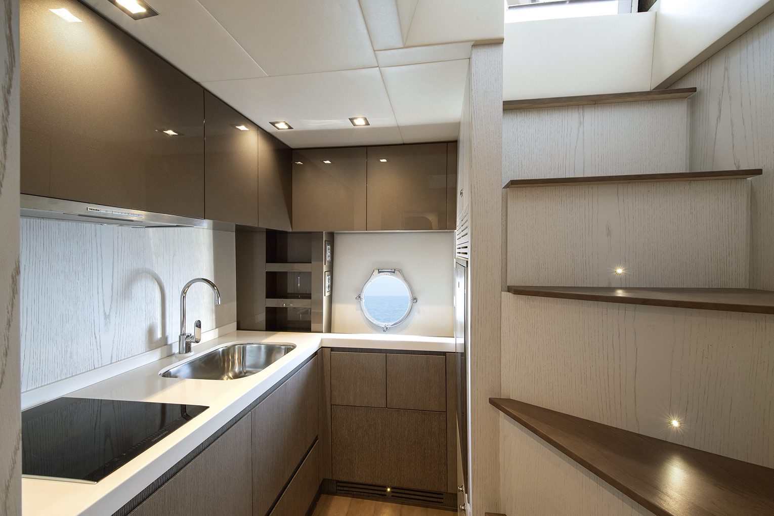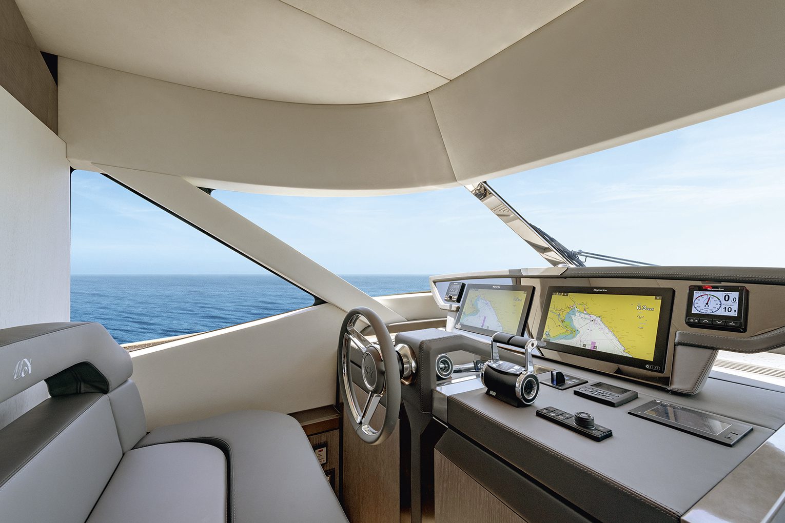 Il 76 ha accolto tutte le innovazioni già viste sul MCY 66: finestrature a scafo più ampie, una continuità spaziale fra pozzetto e salone che esalta l’ergonomia dell’insieme “esterno/interno” e che prosegue nella fluidità di movimento lungo tutta la lunghezza del living. Nel main deck si individuano tre ambienti ben distinti ma organizzati in una sorta di continuità visiva e di movimento. Varcato l’accesso dal pozzetto, troviamo il grande salotto seguito dalla zona formata dalla cucina e dal tavolo da pranzo, poi la plancia di comando e, sulla dritta, la scala per la discesa al ponte inferiore. I designer hanno dunque ribaltato la scelta fatta sul 66 – dove la cucina è a contatto con il pozzetto – optando per una soluzione che consegna all’armatore un ambiente più formale, nel quale si realizza una più netta scansione tra la dimensione del relax, quella della convivialità e quella decisamente più tecnica del comando e della conduzione.