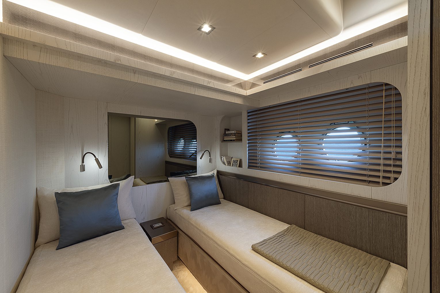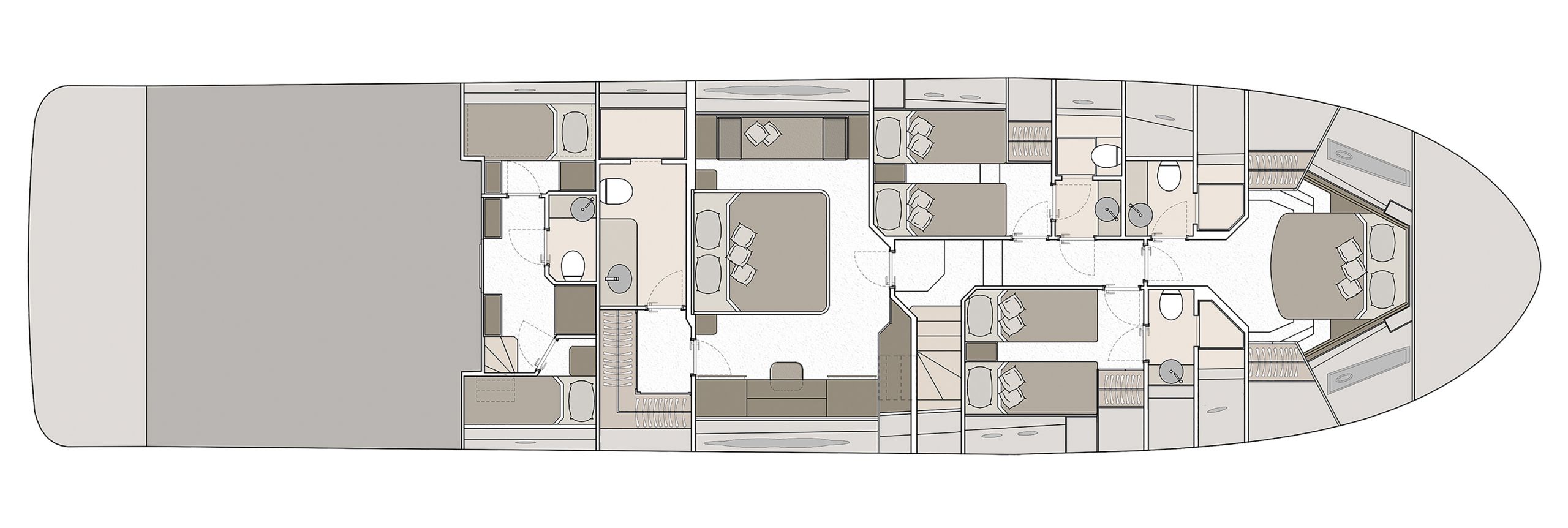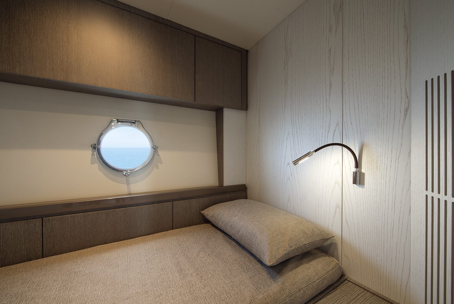Scesa la scala, ci troviamo idealmente al centro della zona notte, una sorte di fulcro attorno al quale si articolano i vari ambienti più privati: a mezzanave, la cabina armatoriale a tutto baglio, celebrazione del lusso inteso come raffinatezza degli arredi e soprattutto come disponibilità di uno spazio esclusivo illuminato da una luce naturale in parte riflessa dal mare; verso prua, due cabine laterali con letti gemelli; in fondo, la cabina vip. Il tutto in un insieme di tonalità chiare, spazio, luce e rifiniture di alto livello.