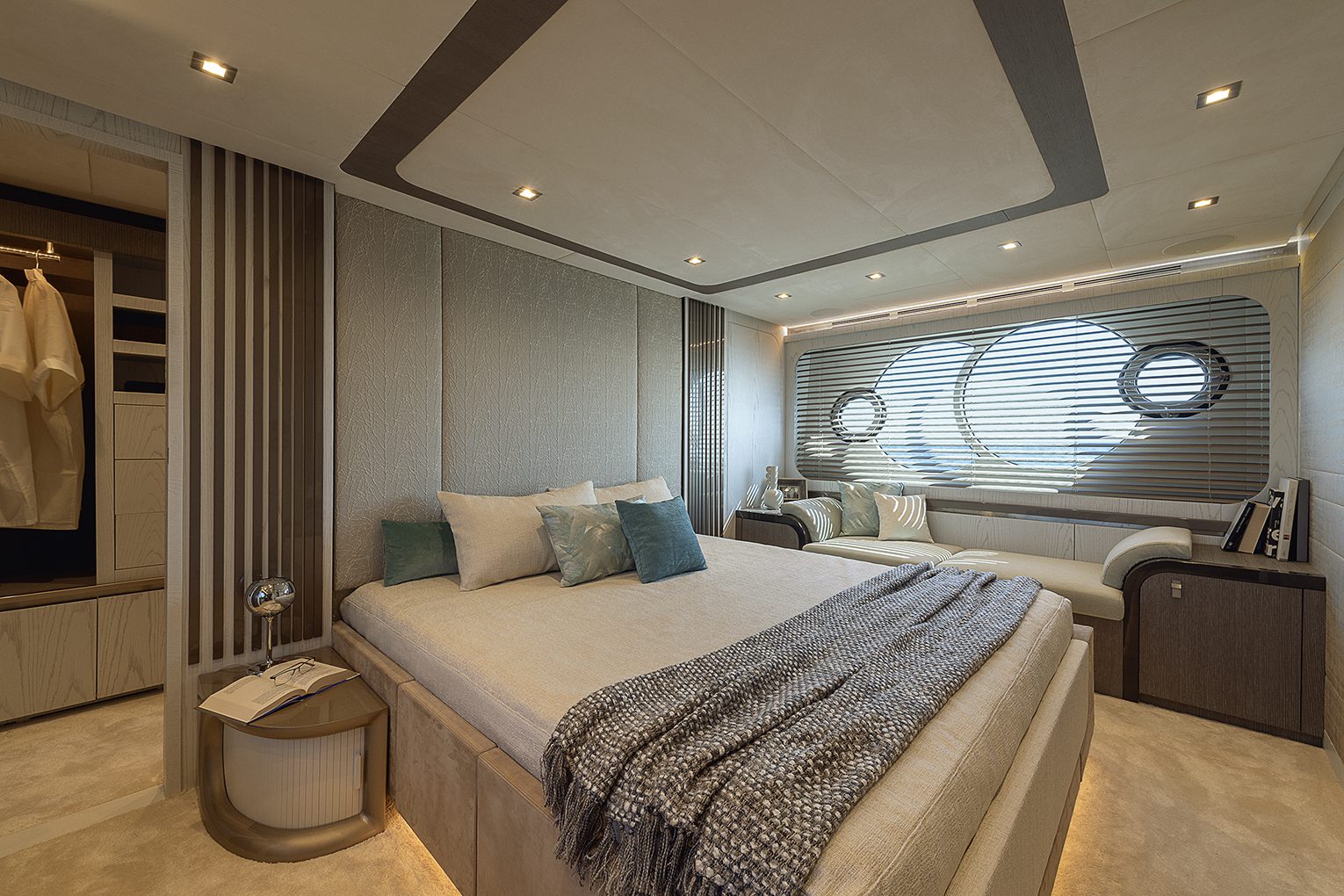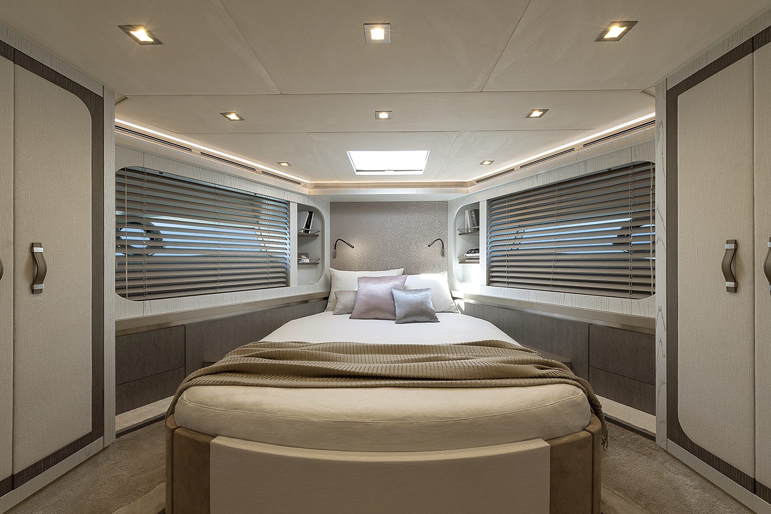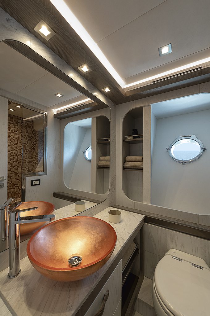 Scesa la scala, ci troviamo idealmente al centro della zona notte, una sorte di fulcro attorno al quale si articolano i vari ambienti più privati: a mezzanave, la cabina armatoriale a tutto baglio, celebrazione del lusso inteso come raffinatezza degli arredi e soprattutto come disponibilità di uno spazio esclusivo illuminato da una luce naturale in parte riflessa dal mare; verso prua, due cabine laterali con letti gemelli; in fondo, la cabina vip. Il tutto in un insieme di tonalità chiare, spazio, luce e rifiniture di alto livello.