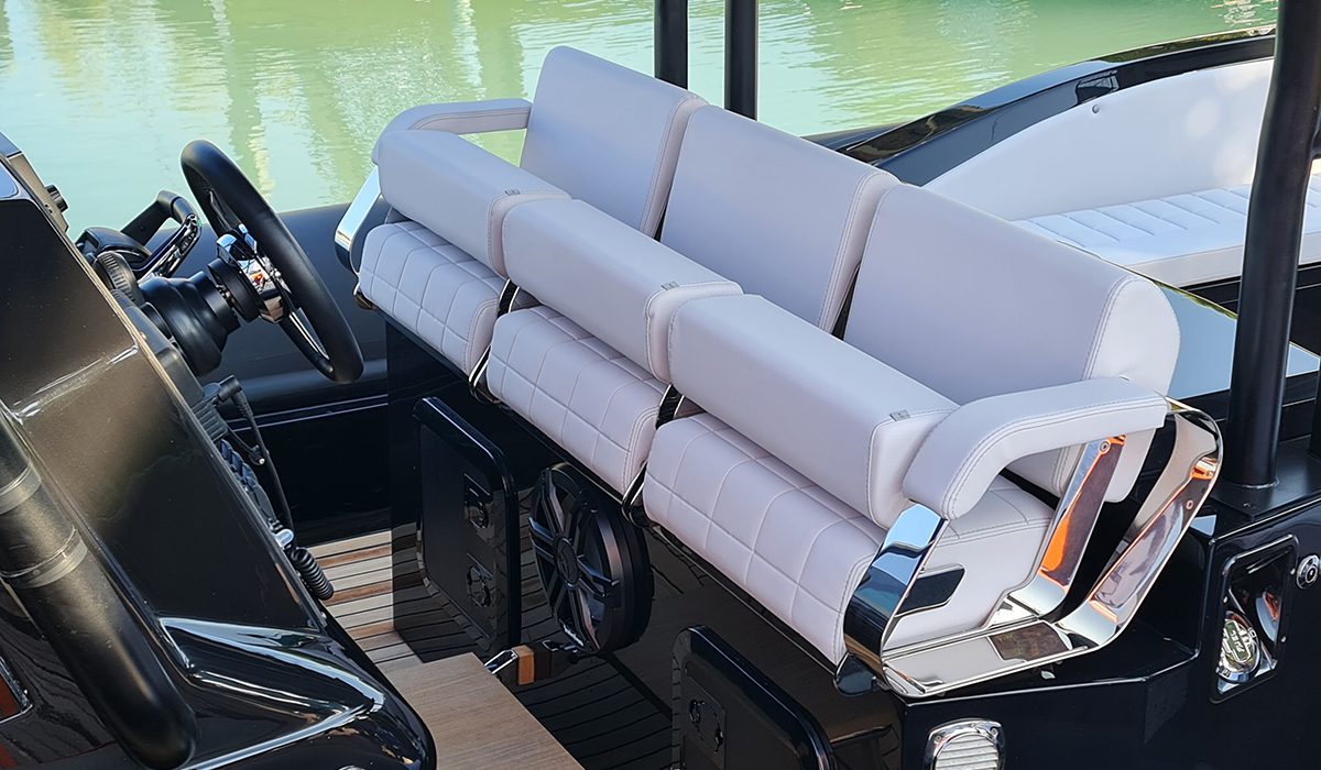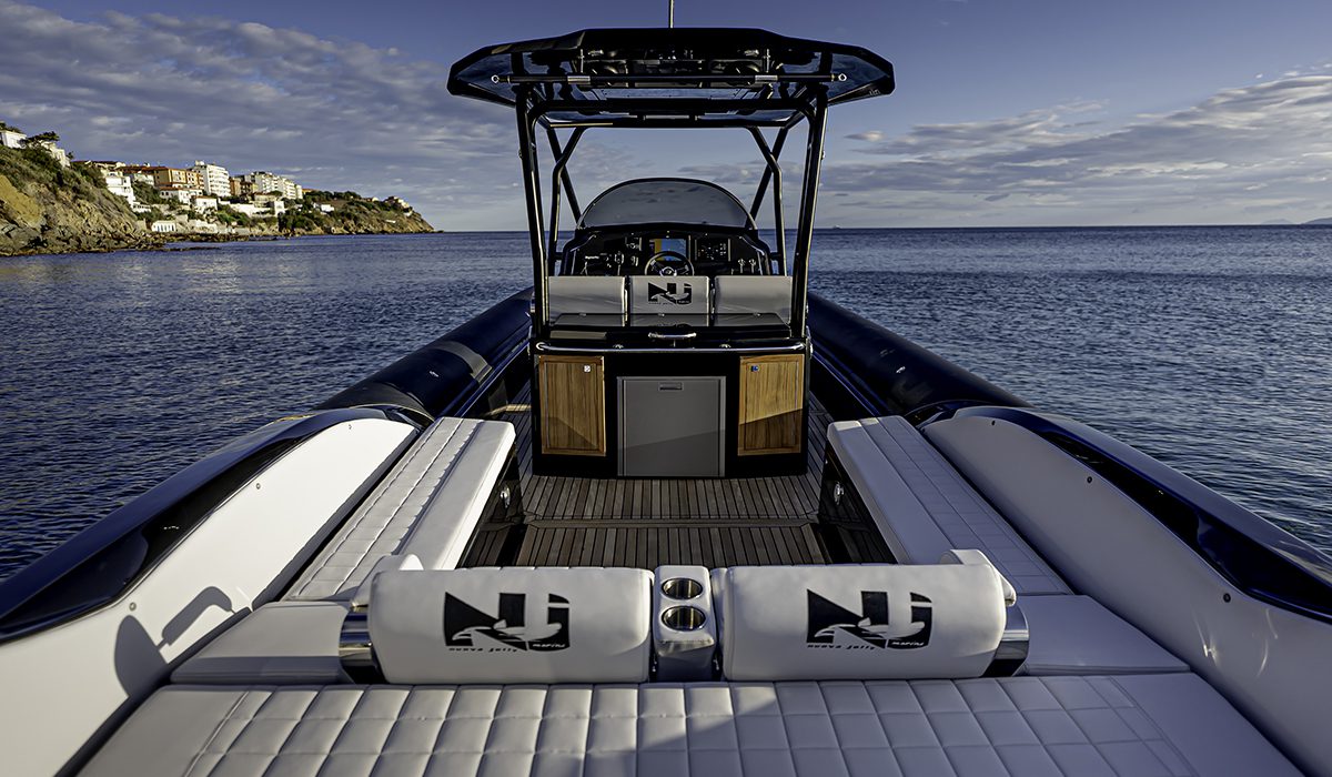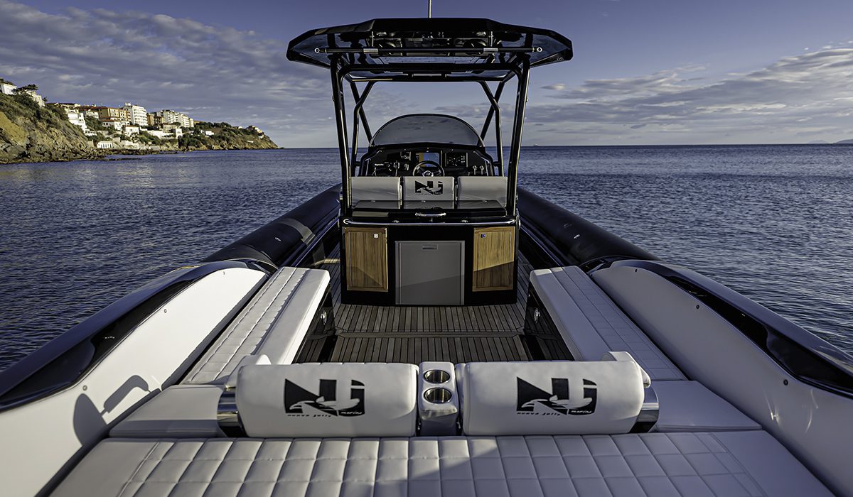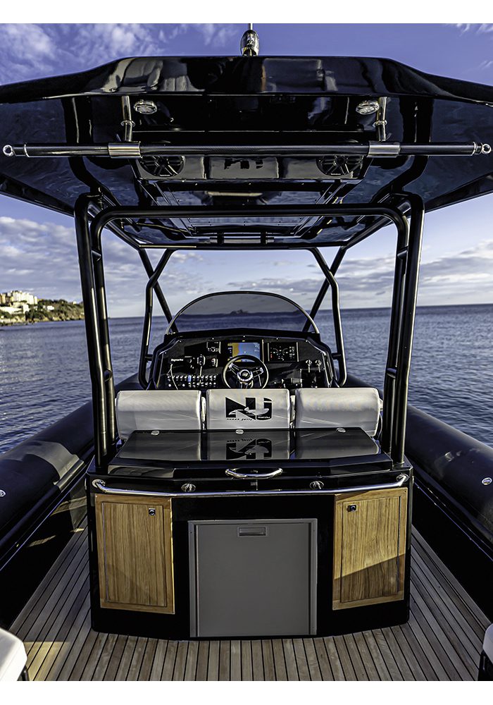 Assolutamente inapprezzabile il leggero ridimensionamento del prendisole che affaccia ora su una plancetta più lunga, posta sui solidi supporti dei due motori. Bello e utile l’hard top sostenuto da tubolari di grossa sezione che, oltre a rendere solido e stabile un componente soggetto a notevoli sollecitazioni, aumentano i punti di presa per i passeggeri che durante la navigazione preferiscono restare in piedi.