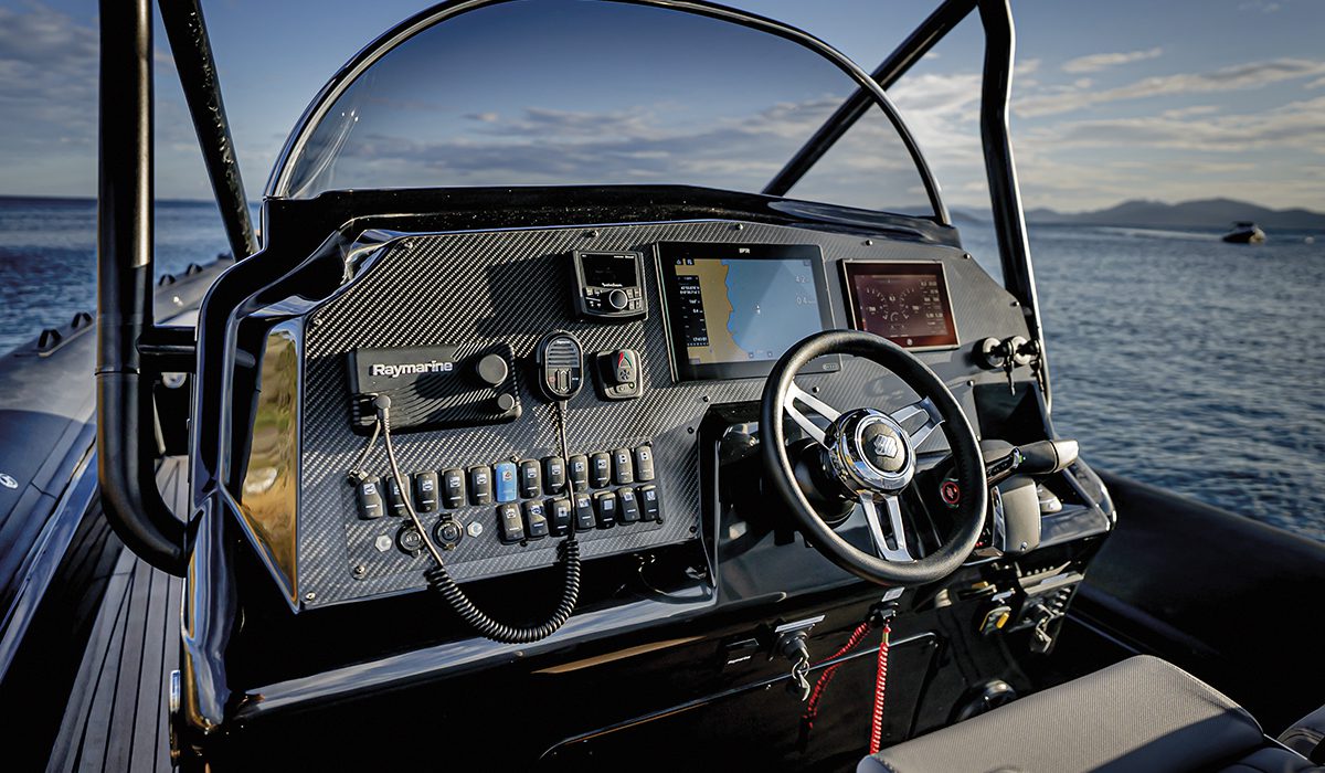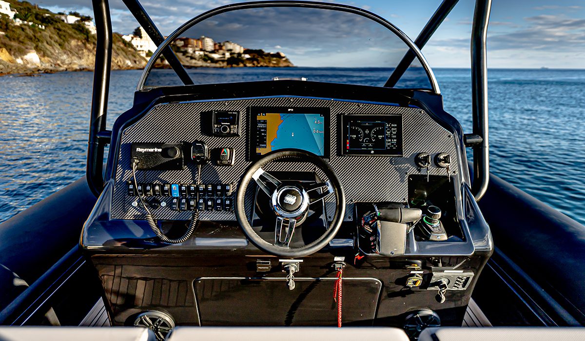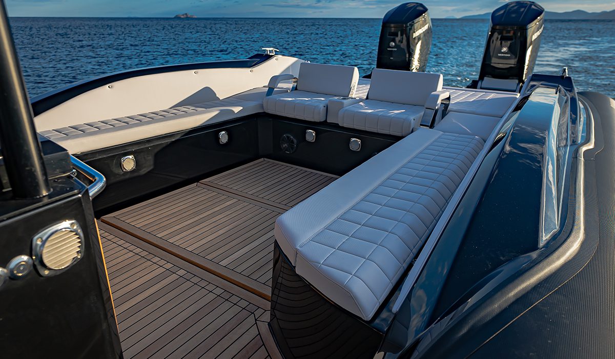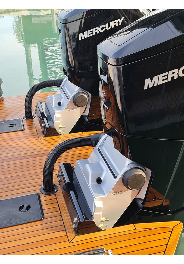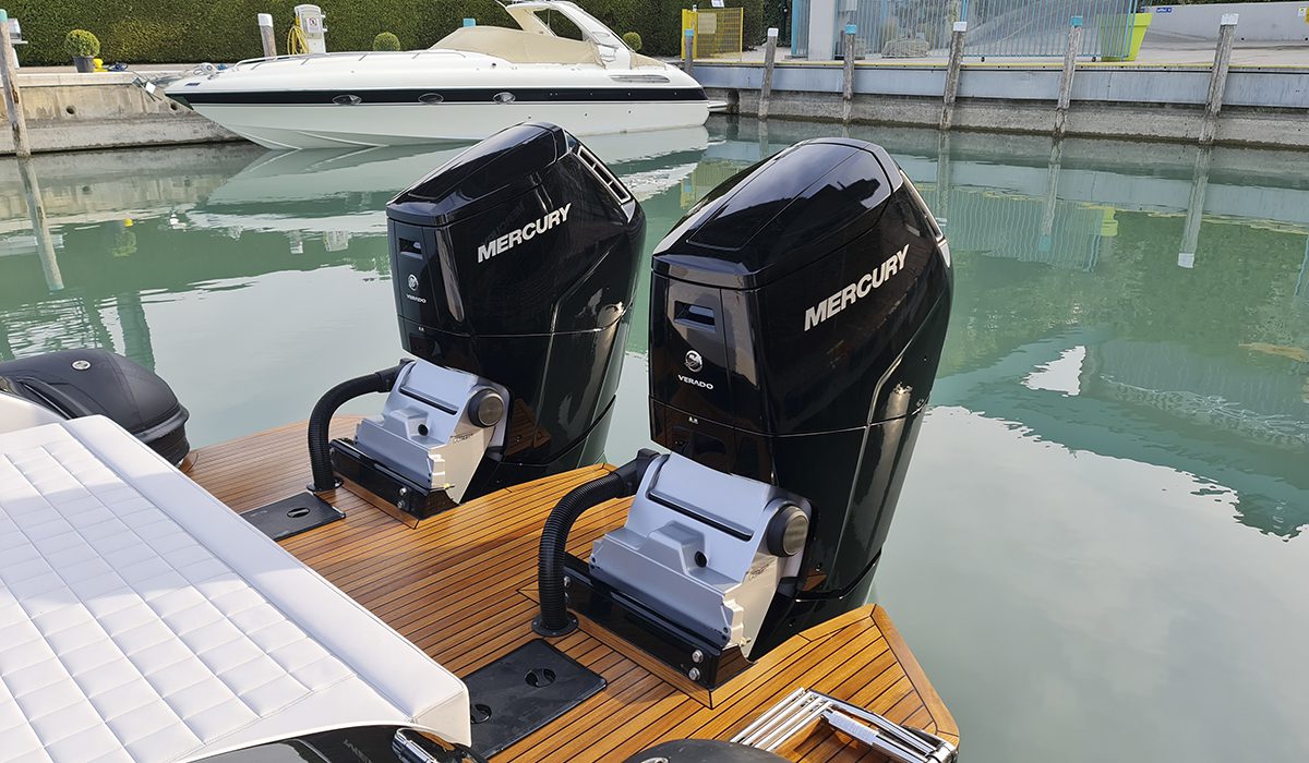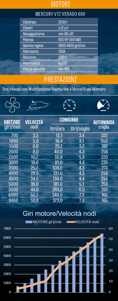 Manco a dirlo, in una barca ad alte prestazioni come questa, gli appigli non sono mai abbastanza e ce ne rendiamo conto sia quando i due fuoribordo, forti del loro cambio a due rapporti automatico, imprimono allo scafo un’accelerazione bruciante, sia quando, nell’ottimo assetto impostato dall’Active Trim, carichi come siamo, filiamo via a circa 54 nodi. Vale la pena di sottolineare come, per quanto poderosa, l’erogazione della potenza risulti sempre controllabile sia per la precisione delle trasmissioni – ricordiamo che il Mercury 600 è il primo fuoribordo nel quale a ruotare è soltanto il piede, mentre il blocco motore resta sempre fermo e allineato – sia per l’ottimo accordo con la carena che, infatti, ci invita a osare accostate decisamente audaci.
