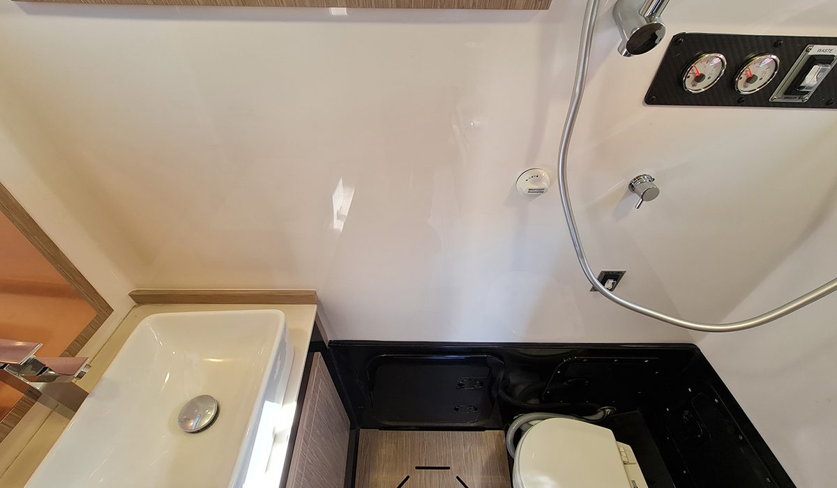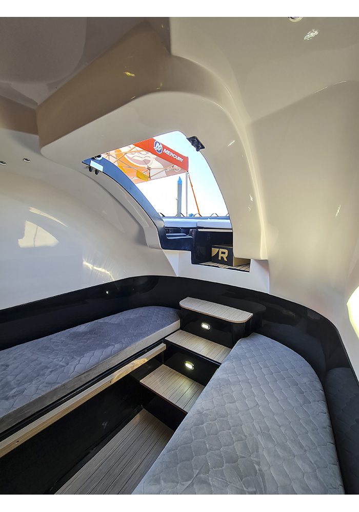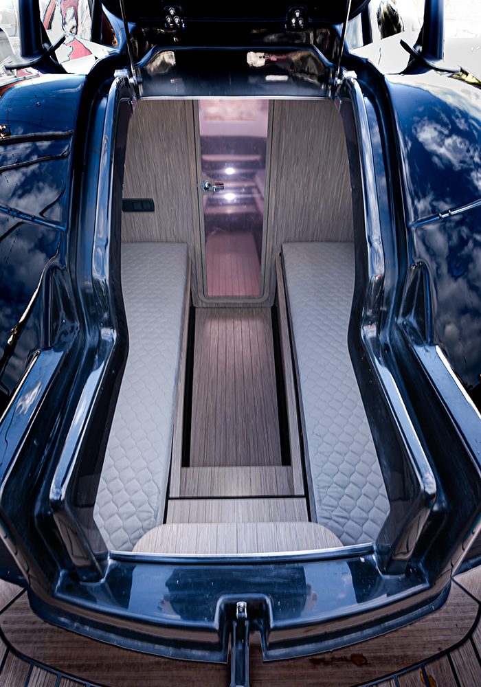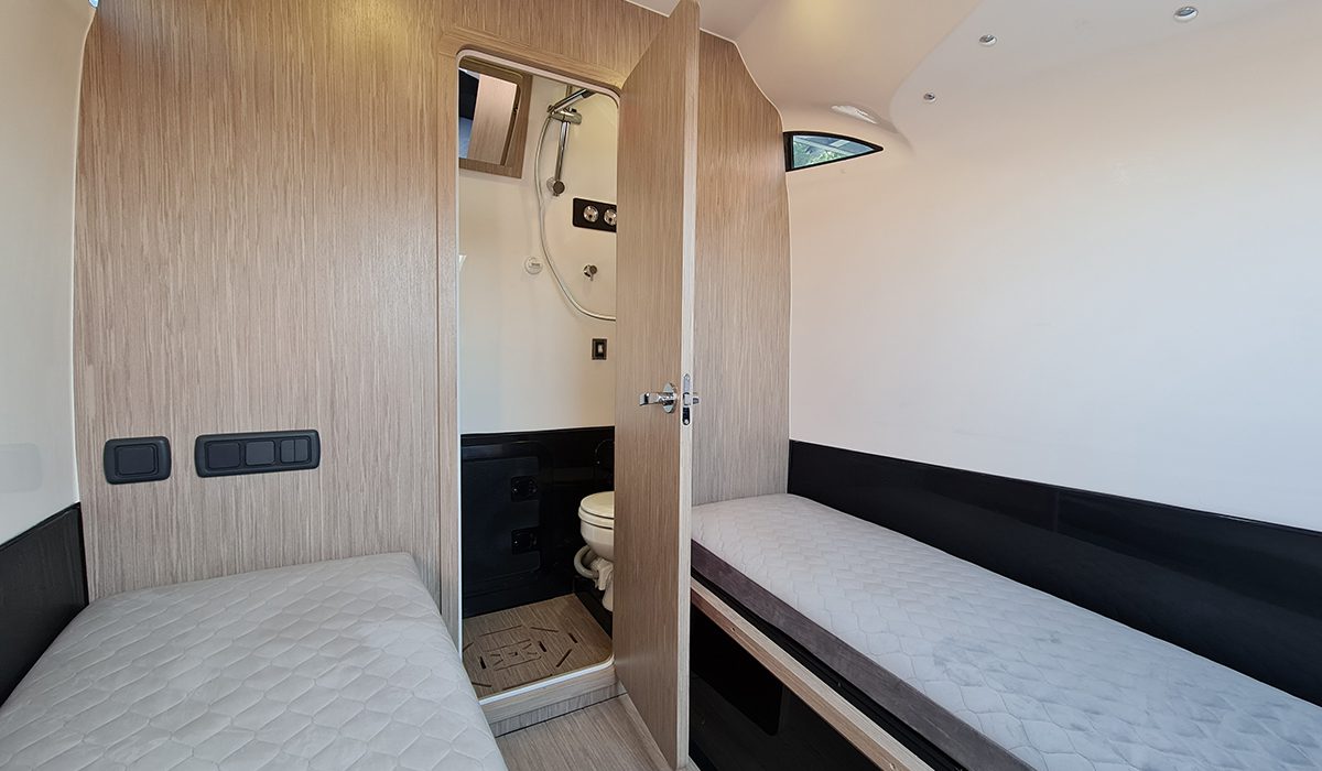 Comoda comunque la cabina alla quale si accede dal portellone frontale con apertura ad ala di gabbiano: due cuccette laterali trasformabili e una toilette separata con doccia. Rispetto alla versione precedente, l’importante rivisitazione della parte esterna poppiera ha aumentato significativamente lo sviluppo delle sedute laterali e, al posto della base dell’originario divano a “U”, ha collocato due poltrone fronte-marcia che, oltre a risultare particolarmente comode, sicure ed ergonomiche, accentuano l’impronta corsaiola dell’insieme.