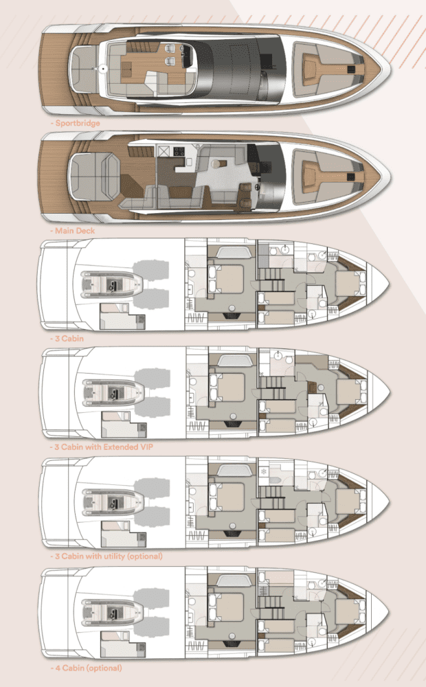 Questo nuovo modello condivide le linee d’acqua del Targa 65 e riprende i generosi volumi della gamma Squadron per creare un mix funzionale e di grande comodità, in cui la complanarità della zona cucina/dinette collegata direttamente al pozzetto consente grande libertà di movimento.
