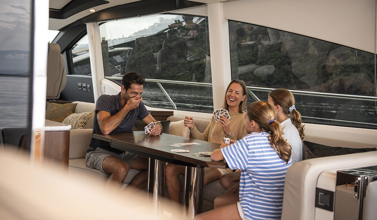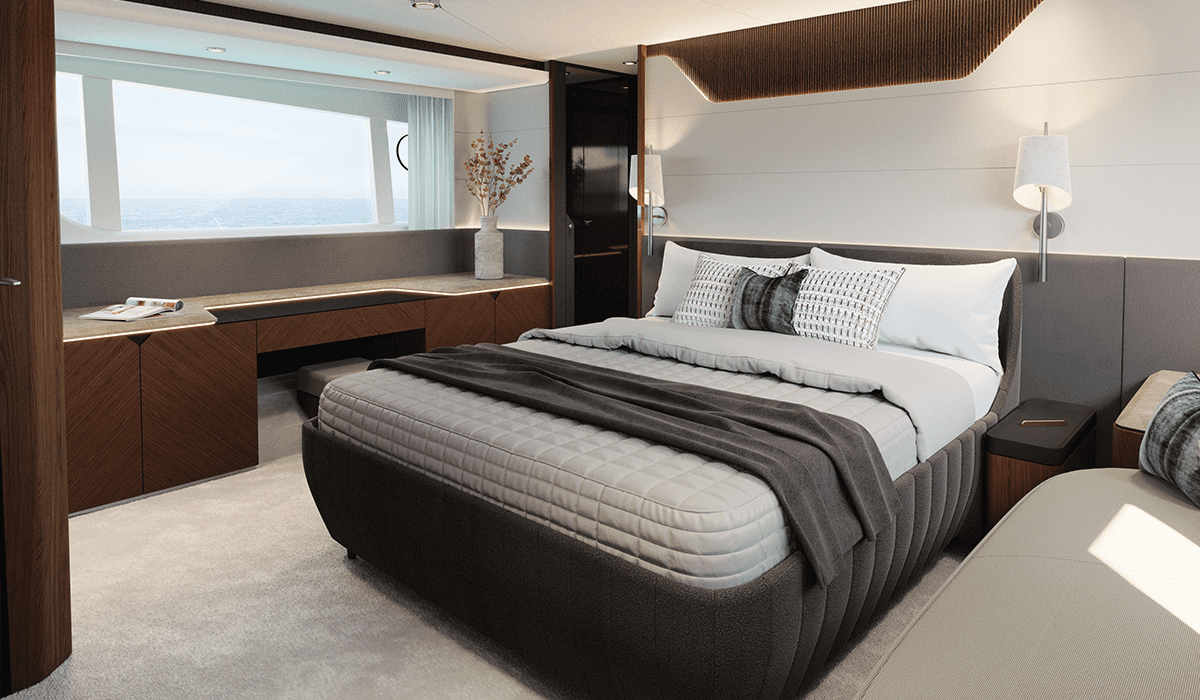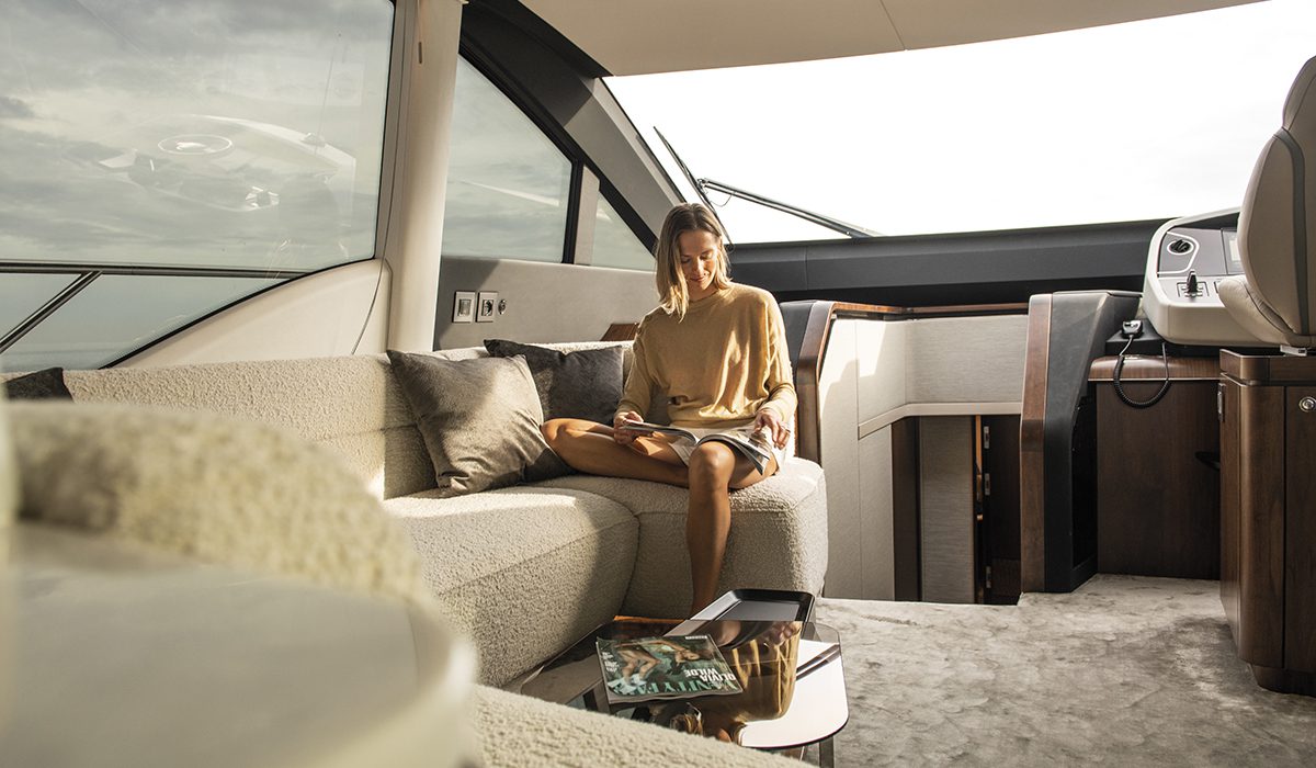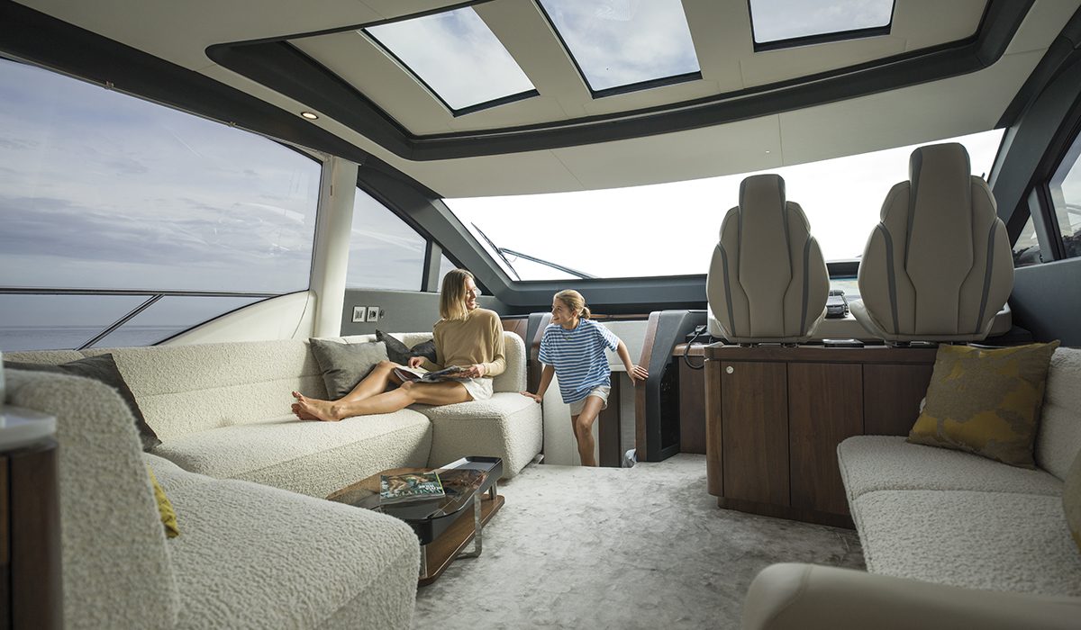 Leggermente rialzata e virtualmente a sé stante, l’area living è particolarmente spaziosa, luminosa e totalmente vista-mare grazie alle ampie finestrature. Gode inoltre di un ulteriore passaggio d’aria e di luce grazie al tettuccio trasparente apribile.