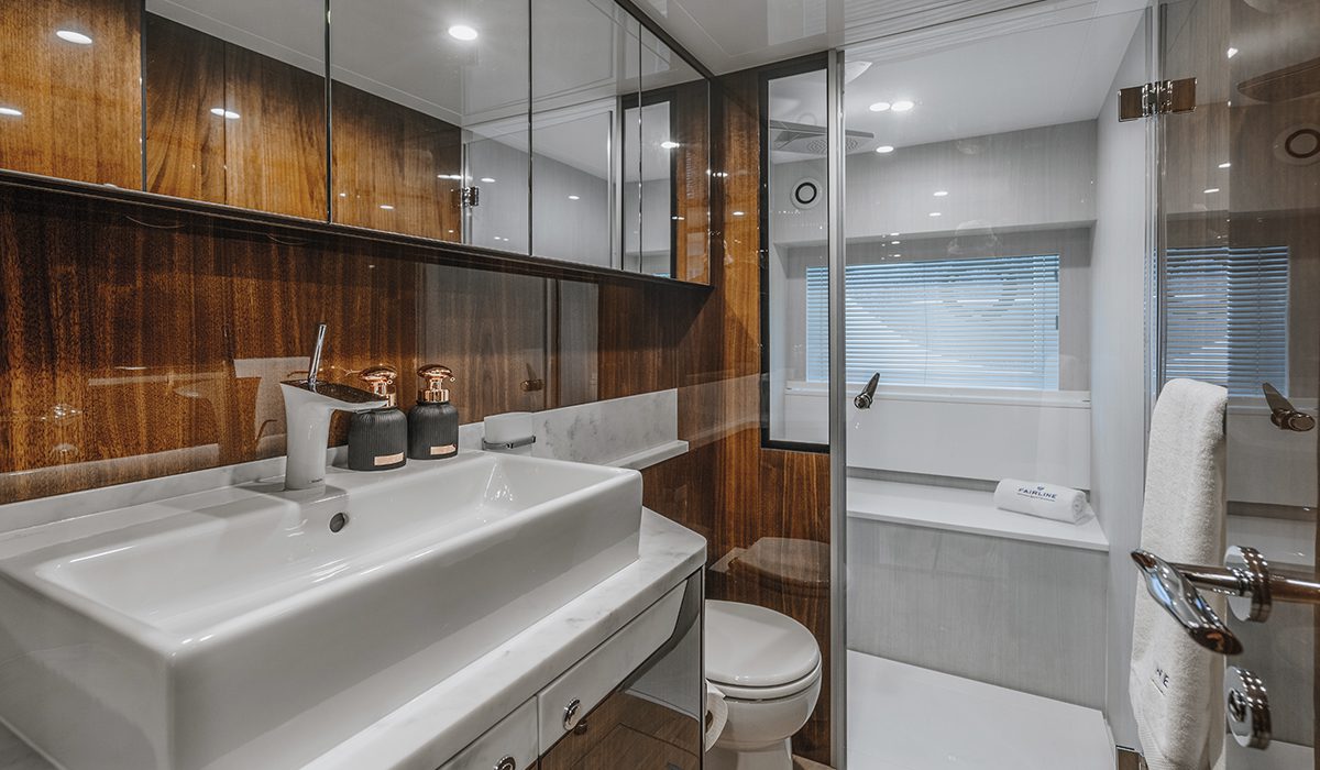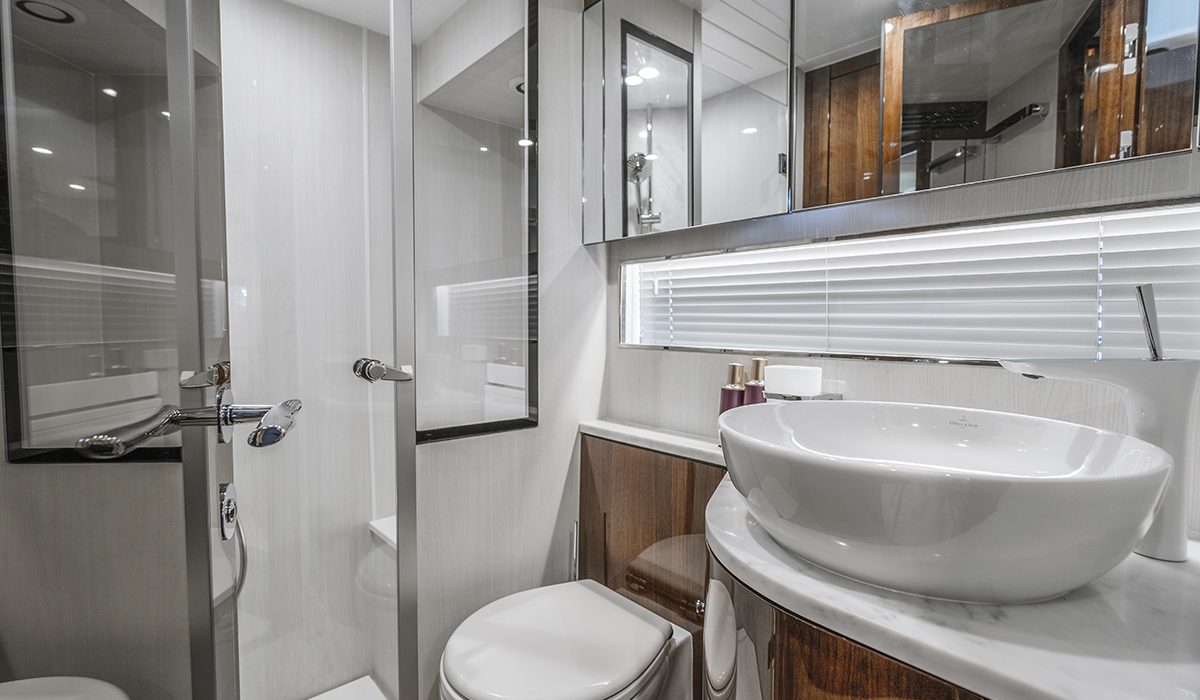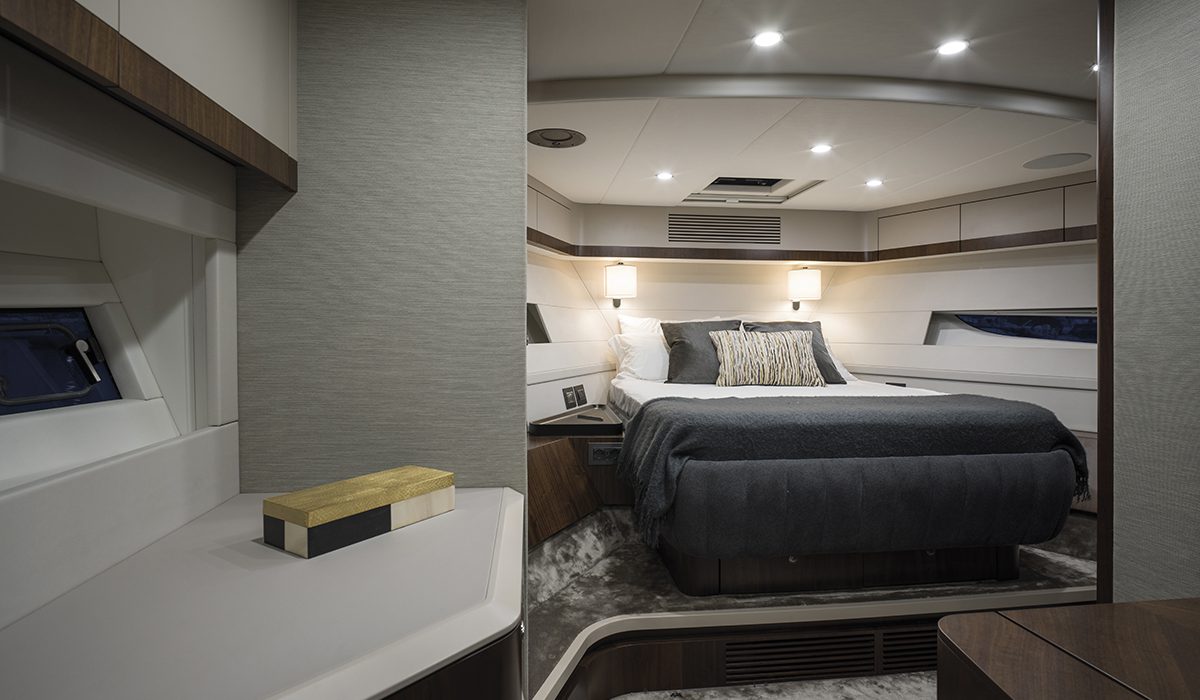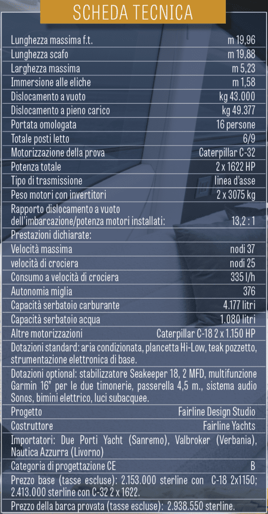 Diverse le soluzioni alternative per la zona notte dove, a prescindere dall’alloggio equipaggio con entrata dalla plancetta poppiera, ci sono tre possibilità per il layout a tre cabine e un ulteriore alternativa con un layout a quattro cabine. Un’alternativa anche per la motorizzazione che, con la potenza massima offerta dai due Caterpillar da 1622 HP montati sull’unità di questa prova, consente di raggiungere i 37 nodi, garantendo un’andatura di crociera di 25-26 nodi: velocità che può essere mantenuta senza problemi anche con mare formato.