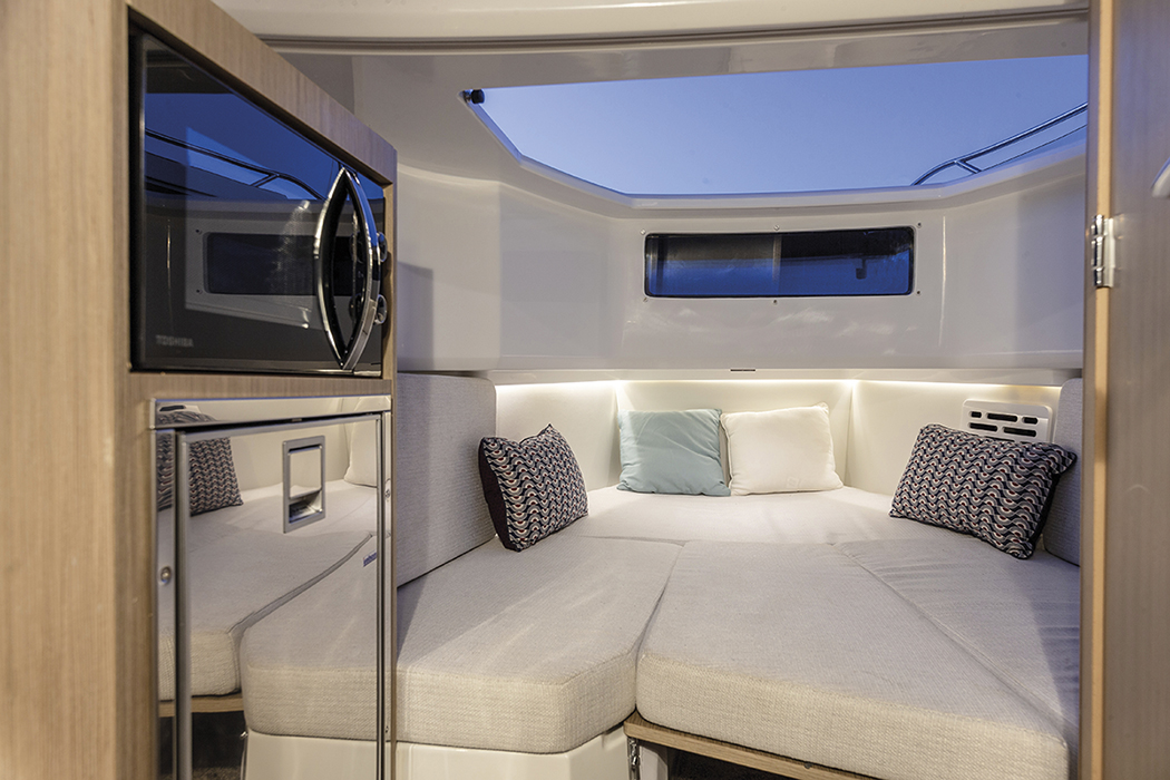 Diciamo “in parte”, perché le sue dimensioni dipendono dalla nota che suona invece cristallina in coperta, ossia la sua configurazione walkaround, che regala una grande mobilità ma che necessariamente riduce di molto l’altezza interna. Una dinette che ha lo stesso carattere di versatilità di tutta la barca, con il tavolino abbattibile che consente di ricavare una cuccetta doppia.