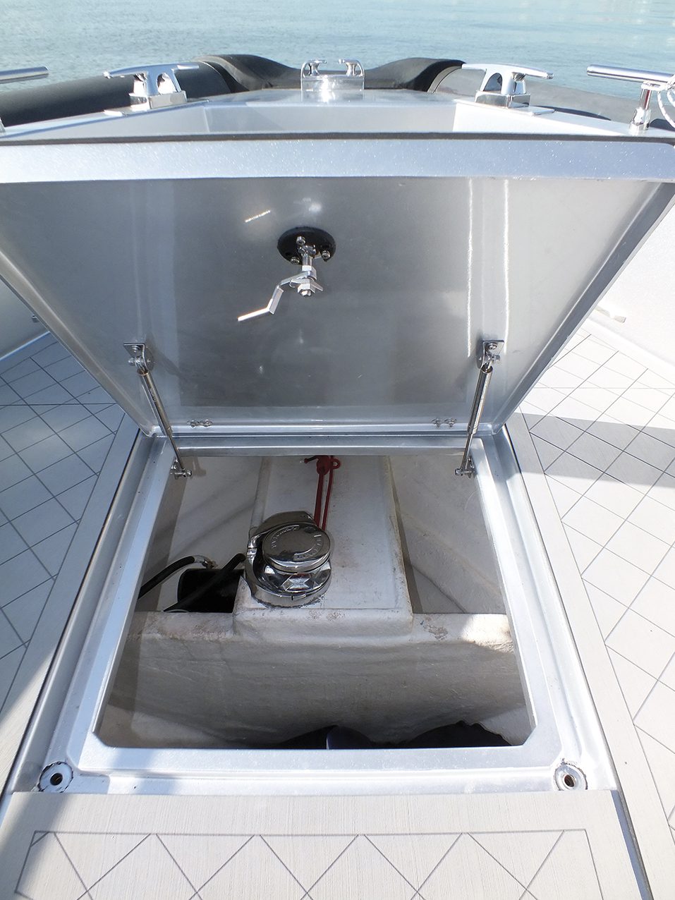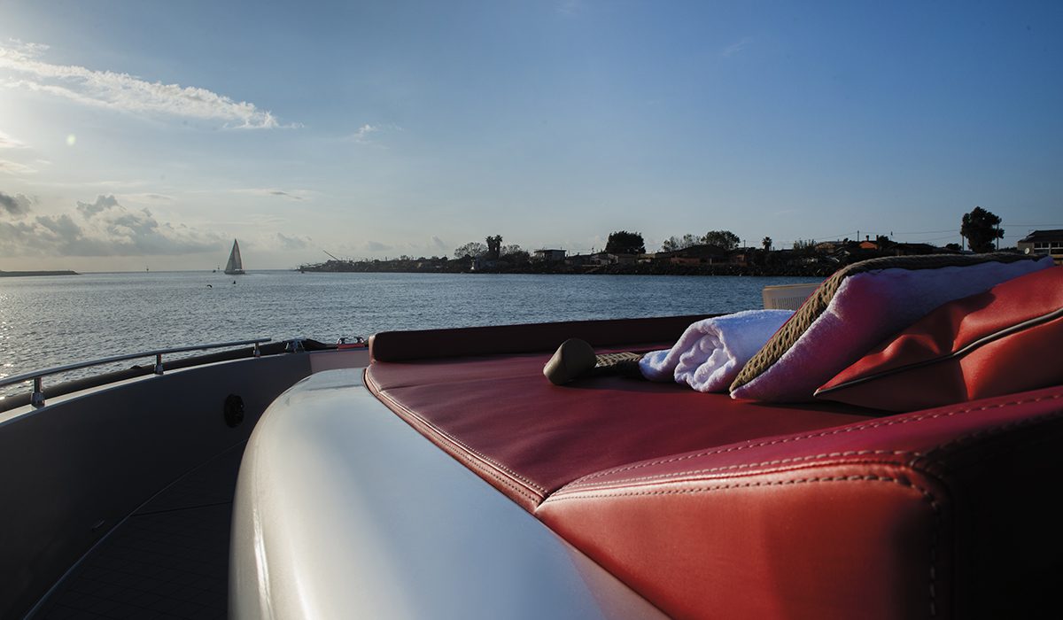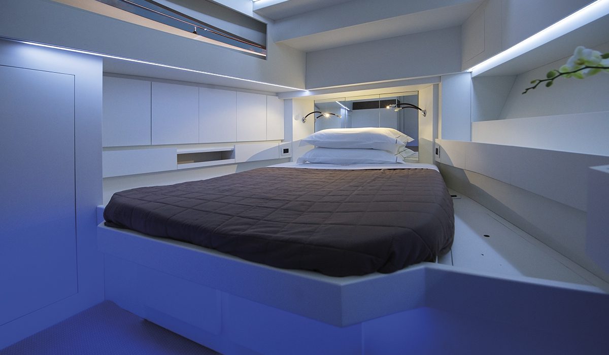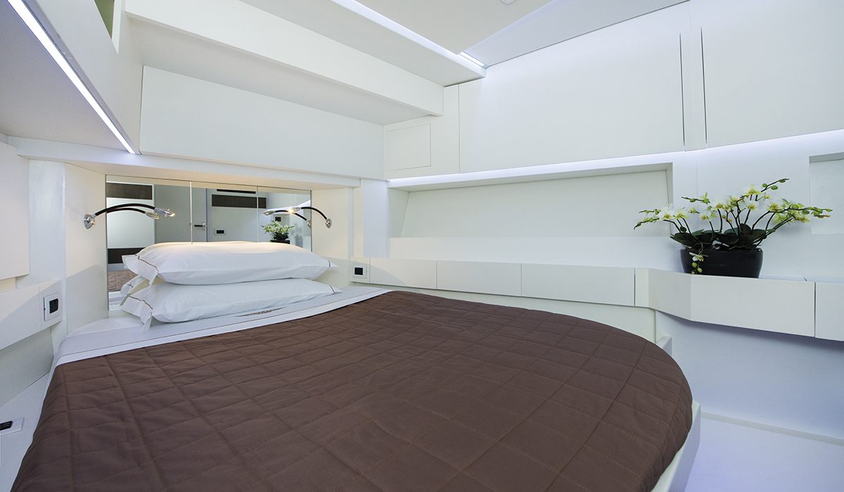 Sottocoperta, la prima sorpresa è rappresentata dal quel metro e 97 di altezza che caratterizza gran parte dei volumi. Anche qui, l’articolazione è netta: due comode cabine matrimoniali – armatoriale a mezzanave, vip a prua – separate da una toilette con box doccia e dal disimpegno d’ingresso. Insomma, un cabinato vero e proprio, peraltro con ampie possibilità di personalizzazione.