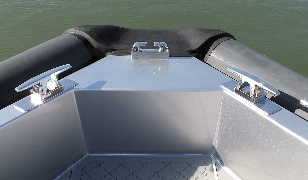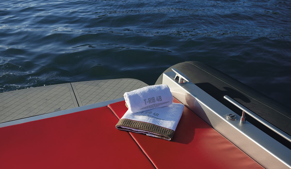 È dunque per questo che, osservando un modello esteticamente sorprendente come il T-Rib 48, si percepisce subito un senso di compiutezza e maturità. Certo, il primo elemento a balzare agli occhi è costituito dalla forma dei tubolari, che alla sinuosità del loro andamento uniscono una rastrematura assai marcata. Ma che la loro funzione incida sulle caratteristiche statiche e dinamiche dello scafo lo fa intuire il contatto delle sezioni terminali con l’acqua.