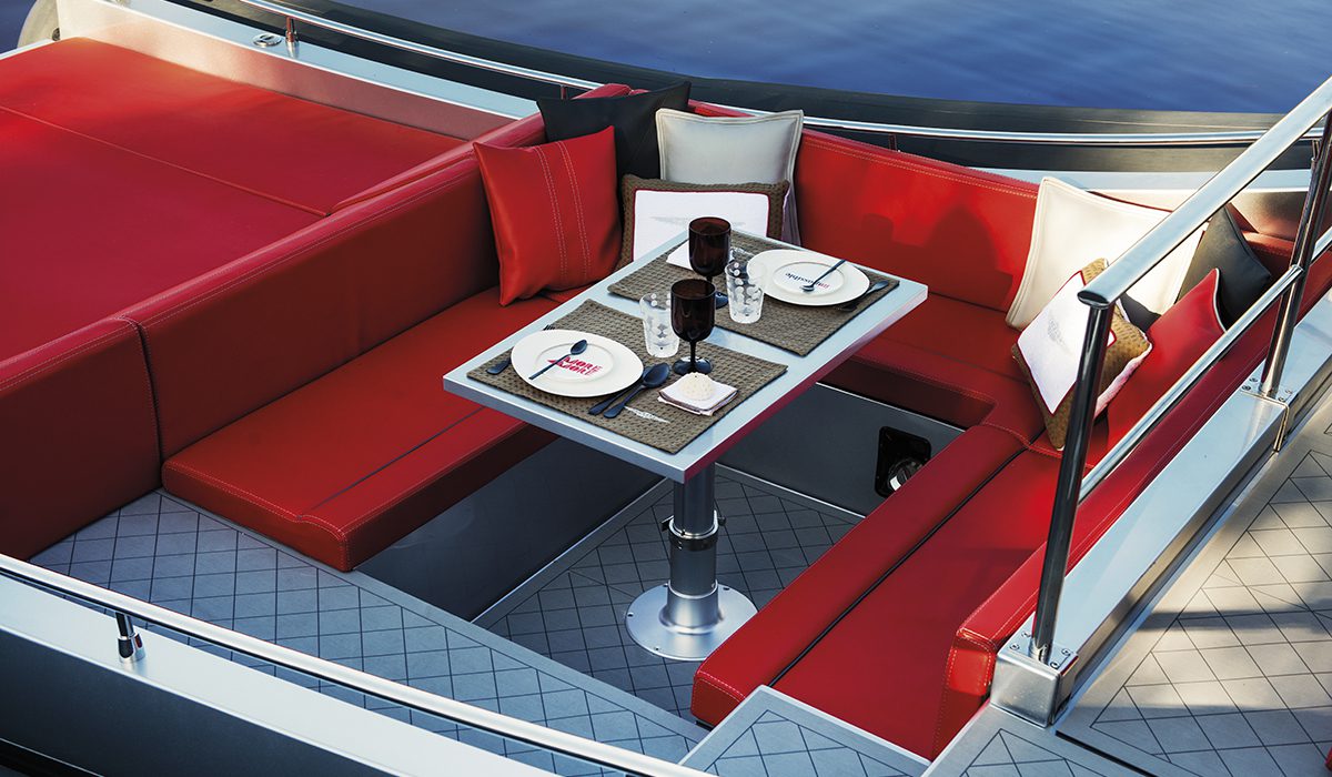 Poi ci sono le superfici esterne, laddove lo studio tecnico del cantiere ha realizzato una netta articolazione funzionale all’interno della struttura di vetroresina che percorre tutta l’unità: un settore di poppa decisamente balneare, con il prendisole direttamente collegato con l’ampia plancetta a sbalzo; una dinette a “U” altamente protettiva; un blocco centrale costituito dalla plancia di comando e dalla cucina; un settore di prua che, raggiungibile attraverso un comodo e sicuro passavanti posto sul lato sinistro, dispone di prendisole e divano a “L”, lasciando un ampio spazio di transito assai utile anche per le manovre di ormeggio.