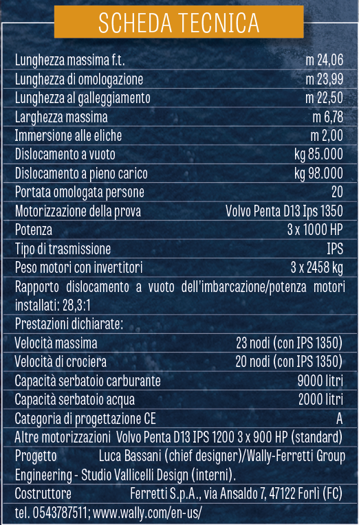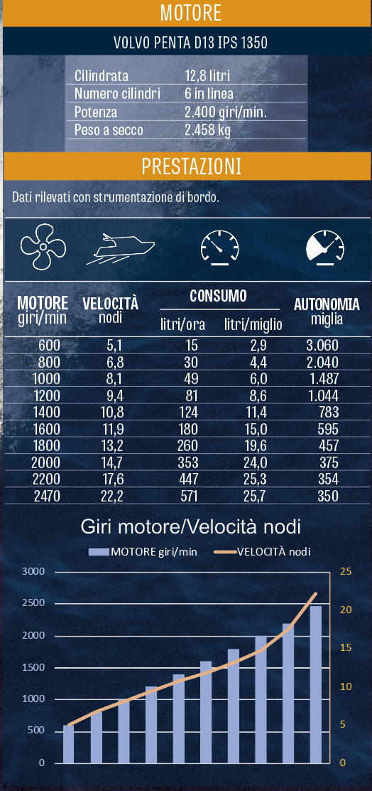 CONDIZIONI – Vento: forza 4 – Mare: 2/3 – Carichi liquidi: carburante 100% – Acqua 70% – Persone: 11 – Pulizia dell’opera viva: buona. RILEVAZIONI – Velocità minima di planata (con interceptor in automatico): 15 nodi – Velocità massima: 22,2 nodi – Velocità al 90% del numero di giri massimo: 18 nodi – Fattore di planata: 1,48 (basso). MISURAZIONI – Area pozzetto: mq 35 – Area flying-bridge: mq 60 – Altezza massima interna (zone transitabili): m 2,72 – Altezza minima interna (zone transitabili): m 2,03 – Altezza alla timoneria interna: m 1,96 – Larghezza minima passavanti: m 0,30.