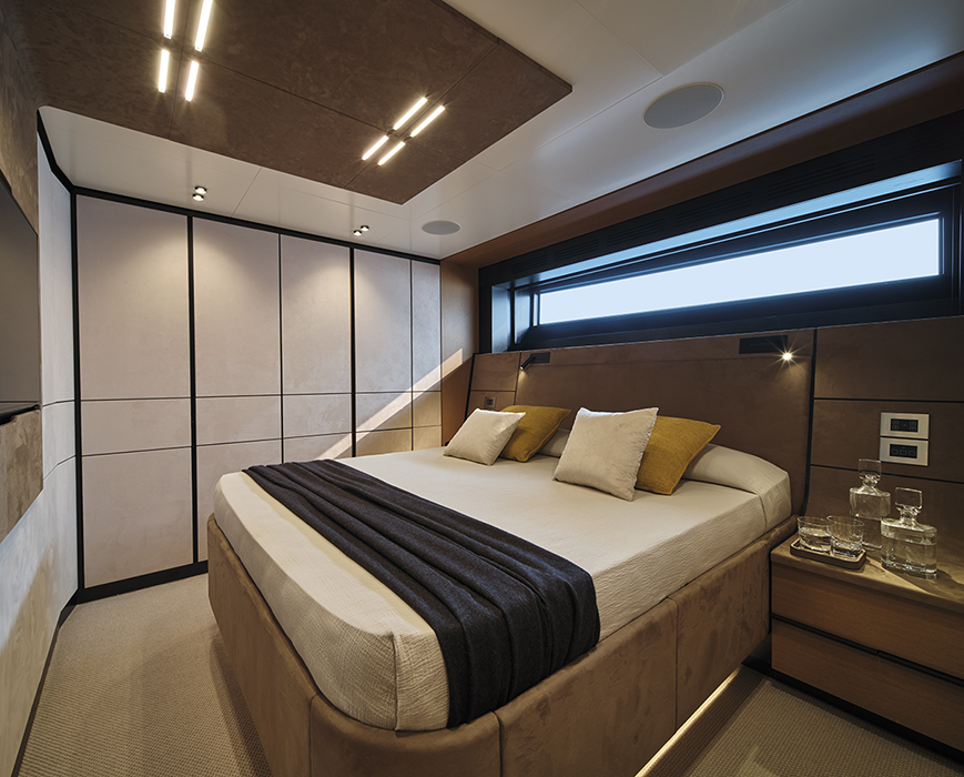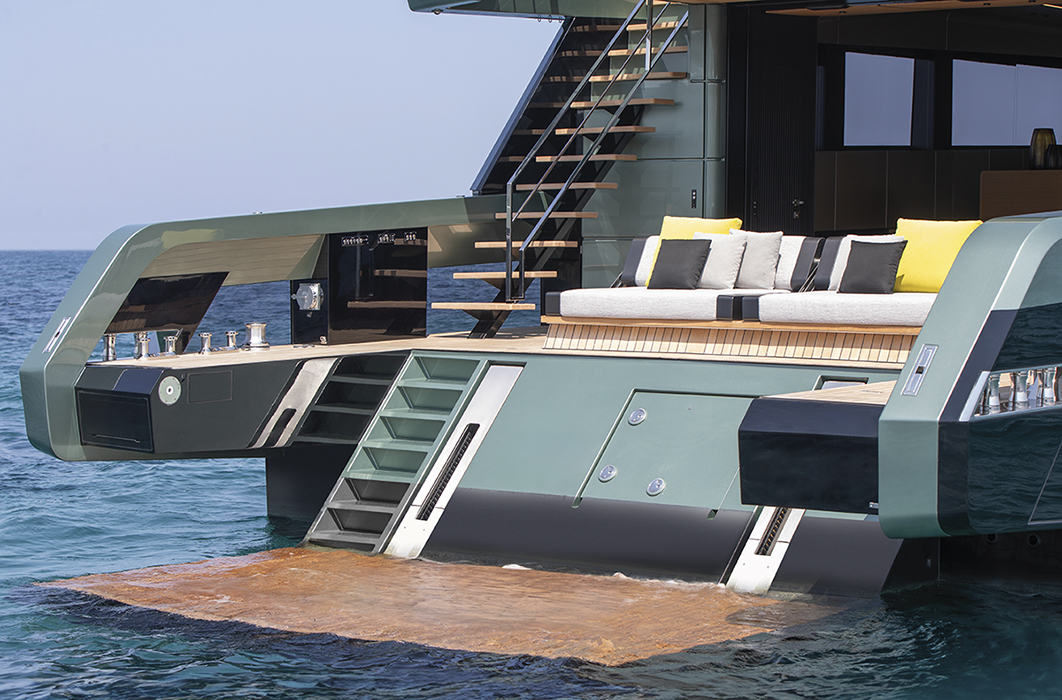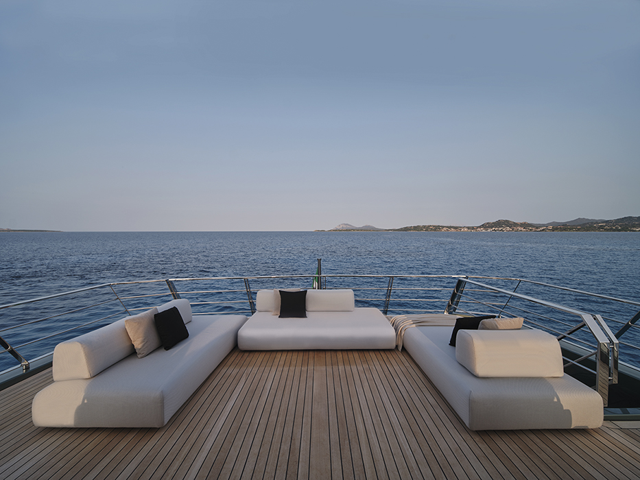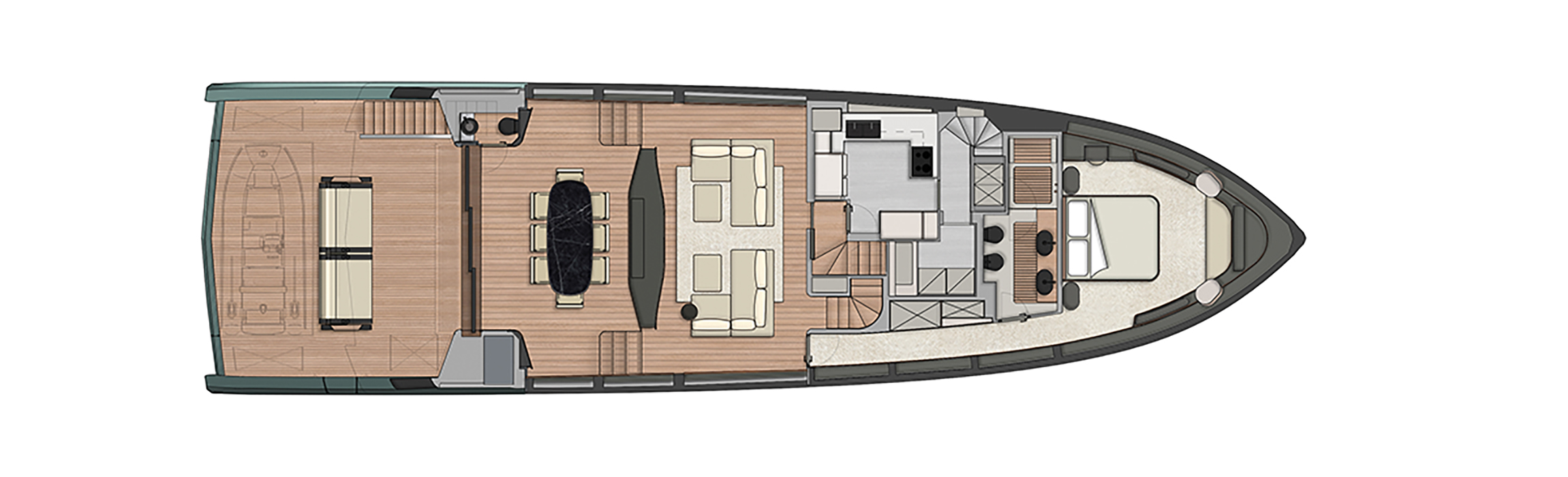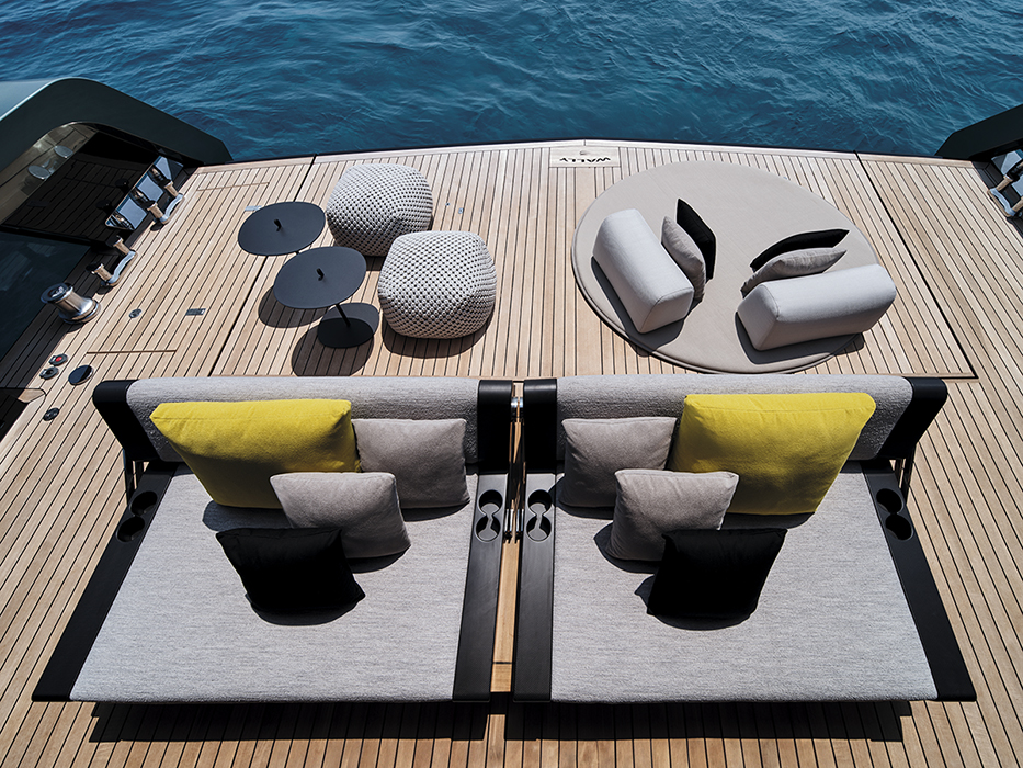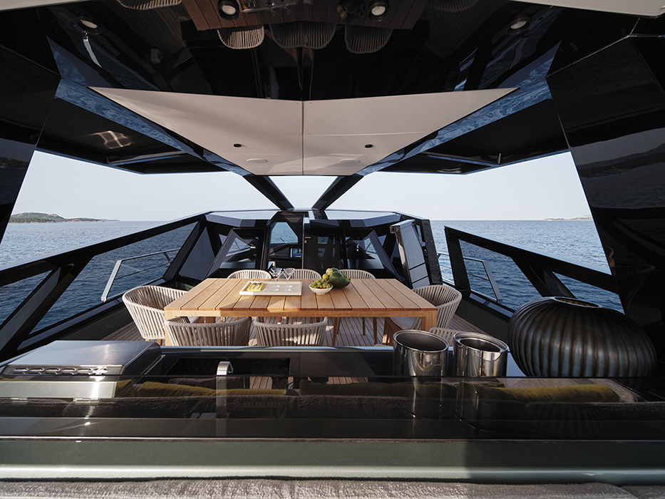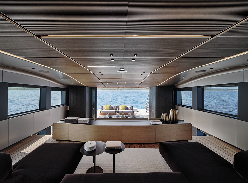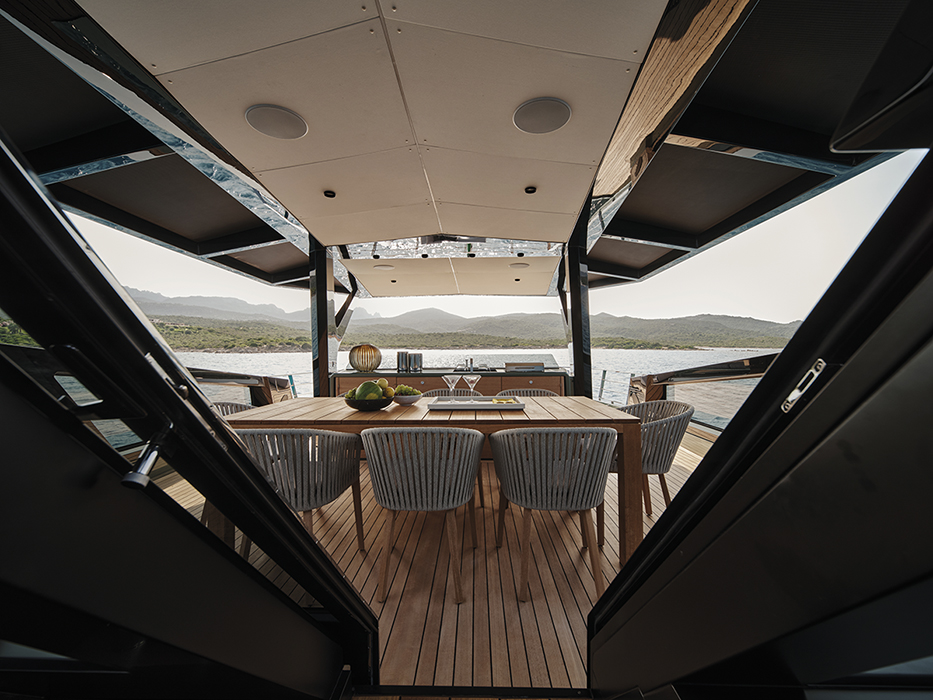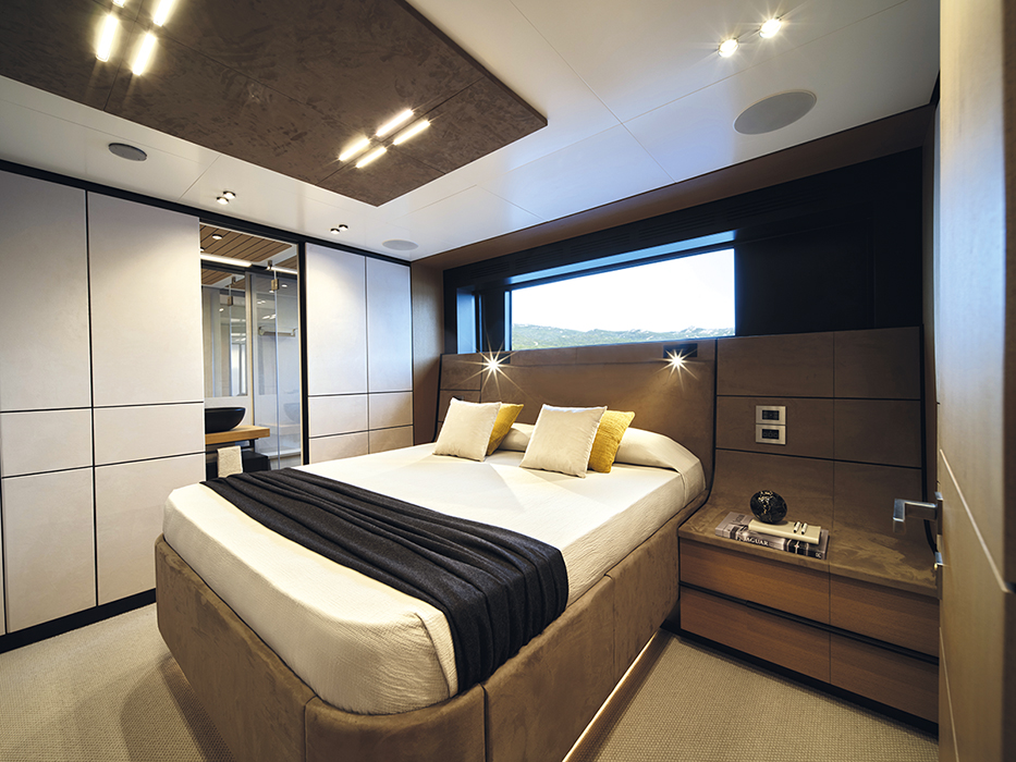 Che si ha guardando verso poppa, come da un palco verso il proscenio, e dalle finestrature laterali a tutta altezza. Punto debole dell’opera morta? Per nulla, anzi. Sono parti strutturali dello scafo, sottoposte a test distruttivi di resistenza meccanica. Dal salone si accede alla beach area – altra novità – senza bisogno di scendere scalini. Organizzata sullo stesso livello del living, non ha certo le caratteristiche di un classico pozzetto, ma piuttosto quelle di una grande terrazza sul mare nella cui parte finale è stata collocata una piattaforma idraulica che, fra l’altro, può ospitare un tender da 3,90 metri.