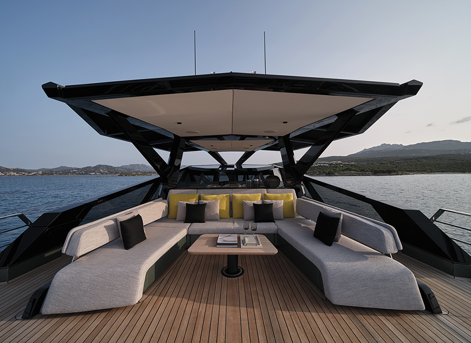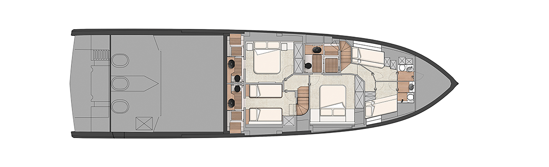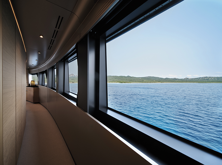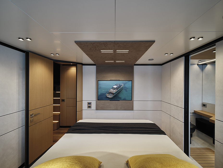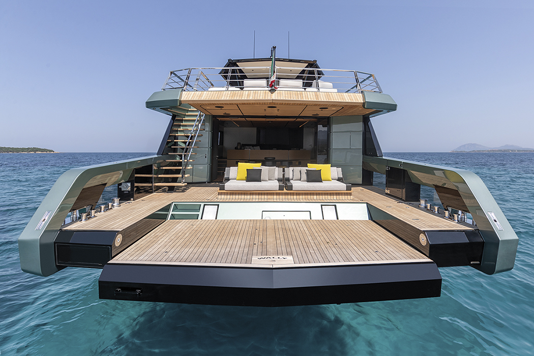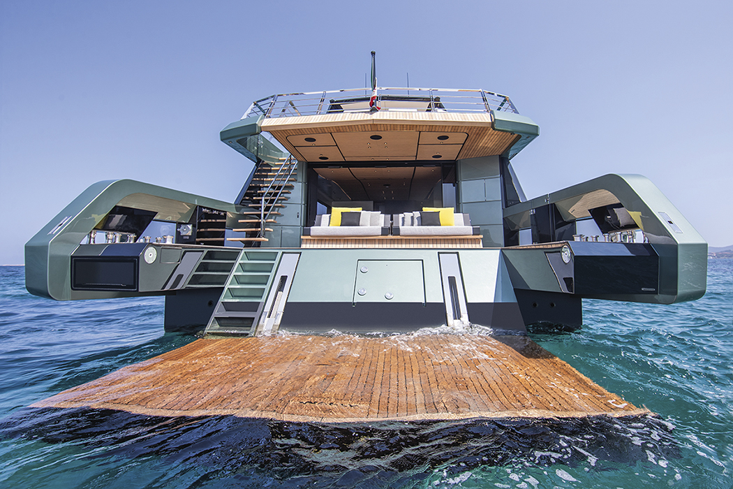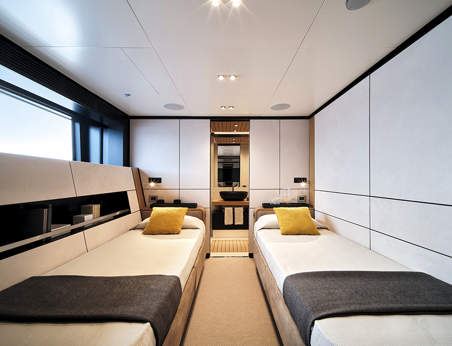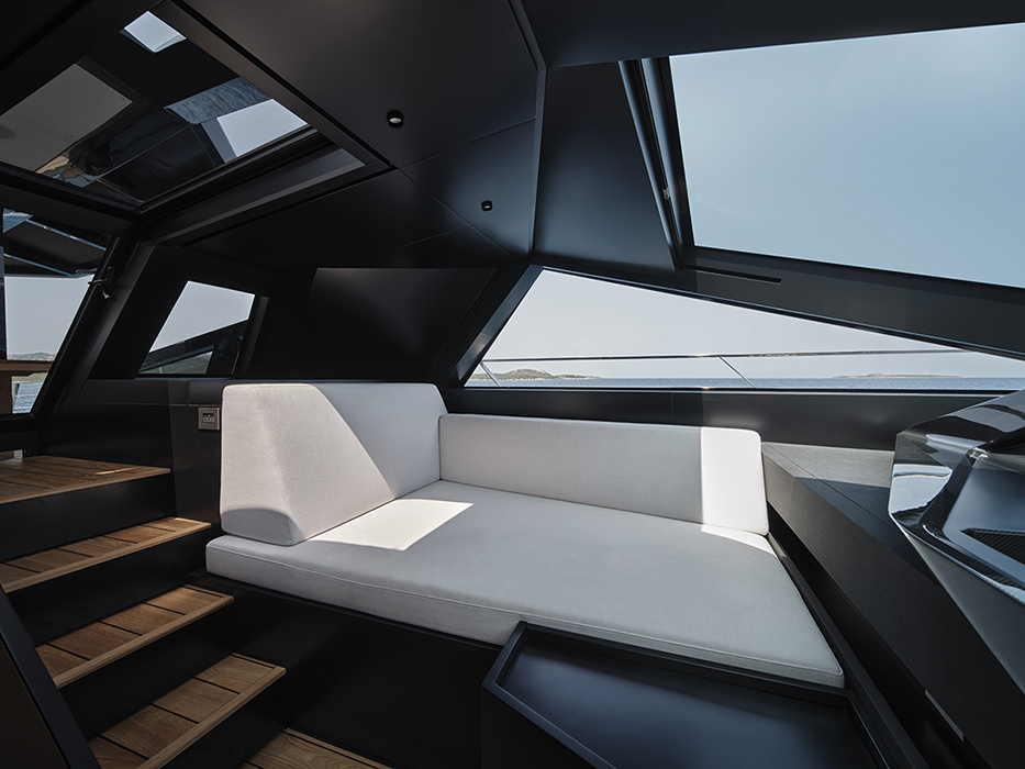 Che si ha guardando verso poppa, come da un palco verso il proscenio, e dalle finestrature laterali a tutta altezza. Punto debole dell’opera morta? Per nulla, anzi. Sono parti strutturali dello scafo, sottoposte a test distruttivi di resistenza meccanica. Dal salone si accede alla beach area – altra novità – senza bisogno di scendere scalini. Organizzata sullo stesso livello del living, non ha certo le caratteristiche di un classico pozzetto, ma piuttosto quelle di una grande terrazza sul mare nella cui parte finale è stata collocata una piattaforma idraulica che, fra l’altro, può ospitare un tender da 3,90 metri.