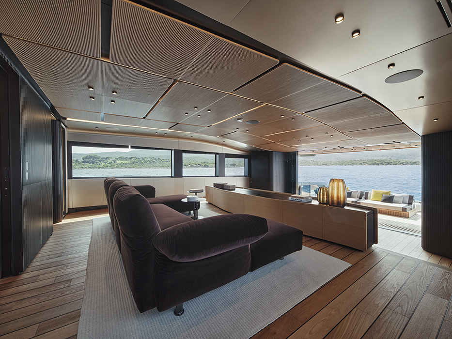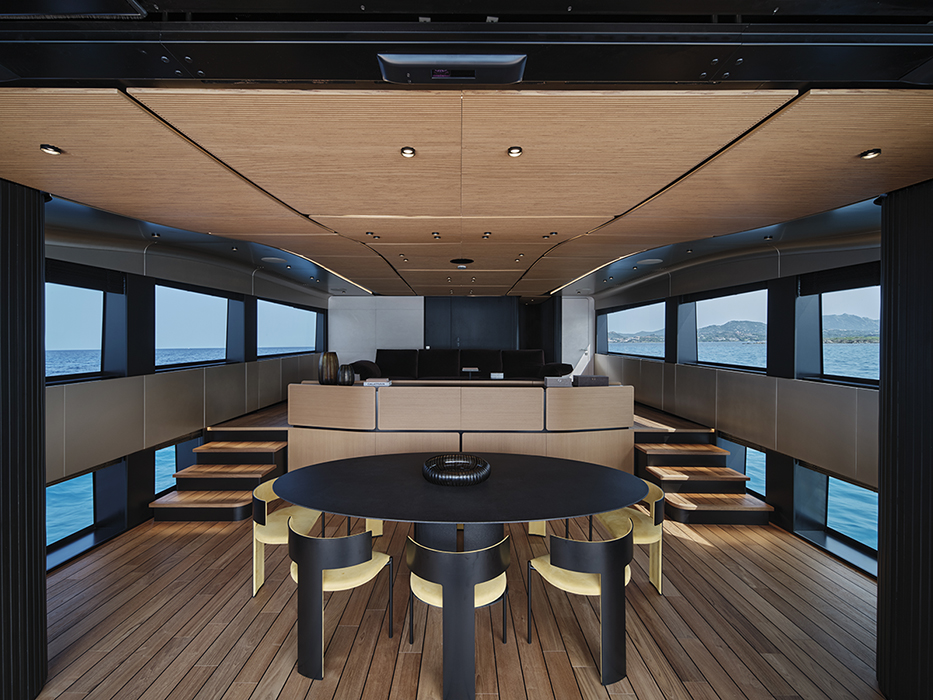 Arretrando verso poppa, si accede al grande salone. I due livelli su cui è organizzato definiscono due diverse destinazioni d’uso – un salotto nella parte alta e una zona pranzo in quella bassa – accomunate dalla nota dominante che riecheggia in tutte le parti del WallyWhy150, ossia il contatto visivo con il mare.