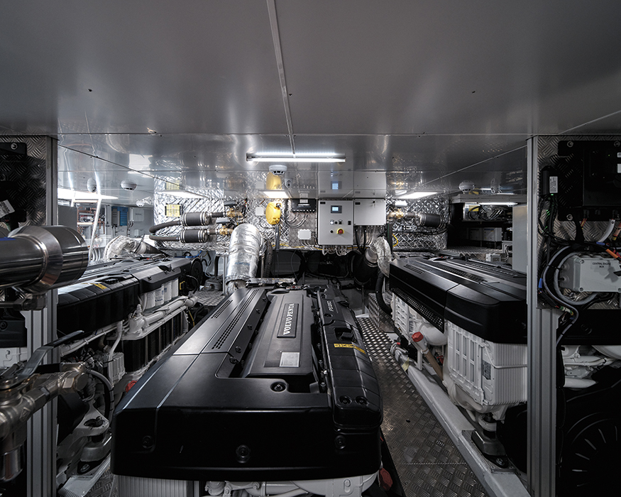 E se il ponte inferiore, dov’è stata organizzata la zona notte, offre un’articolazione degli spazi piuttosto classica, con la possibilità di avere una cabina vip più una ospiti doppia e una con due letti oppure due vip, per nulla classico è il sistema di aerazione. Sullo scafo, infatti, non ci sono oblò; la luce inonda gli interni attraverso le finestrature strutturali, mentre un raffinato impianto garantisce sei ricambi di aria ogni ora. Le prestazioni in mare sono quelle che ci si aspetta da una carena ibrida. Un vento fresco di tramontana ha alzato un’onda molto corta che non viene minimamente avvertita. La progressione con la quale lo scafo prende velocità riflette una situazione di comfort assoluto in tutte le condizioni. Spinto da tre Volvo Penta Ips 1350 da 1000 HP, con 11 persone a bordo e i serbatoi del carburante pieni, il WallyWhy150 tocca i 22,3 nodi a 2470 giri bruciando 571 litri l’ora.