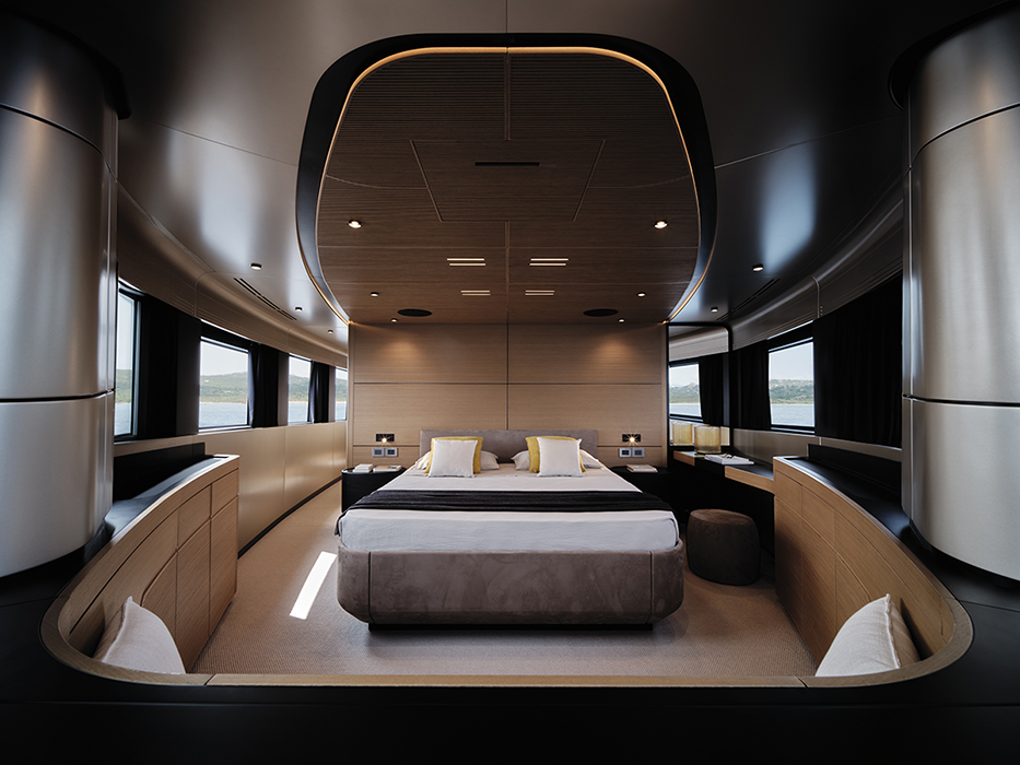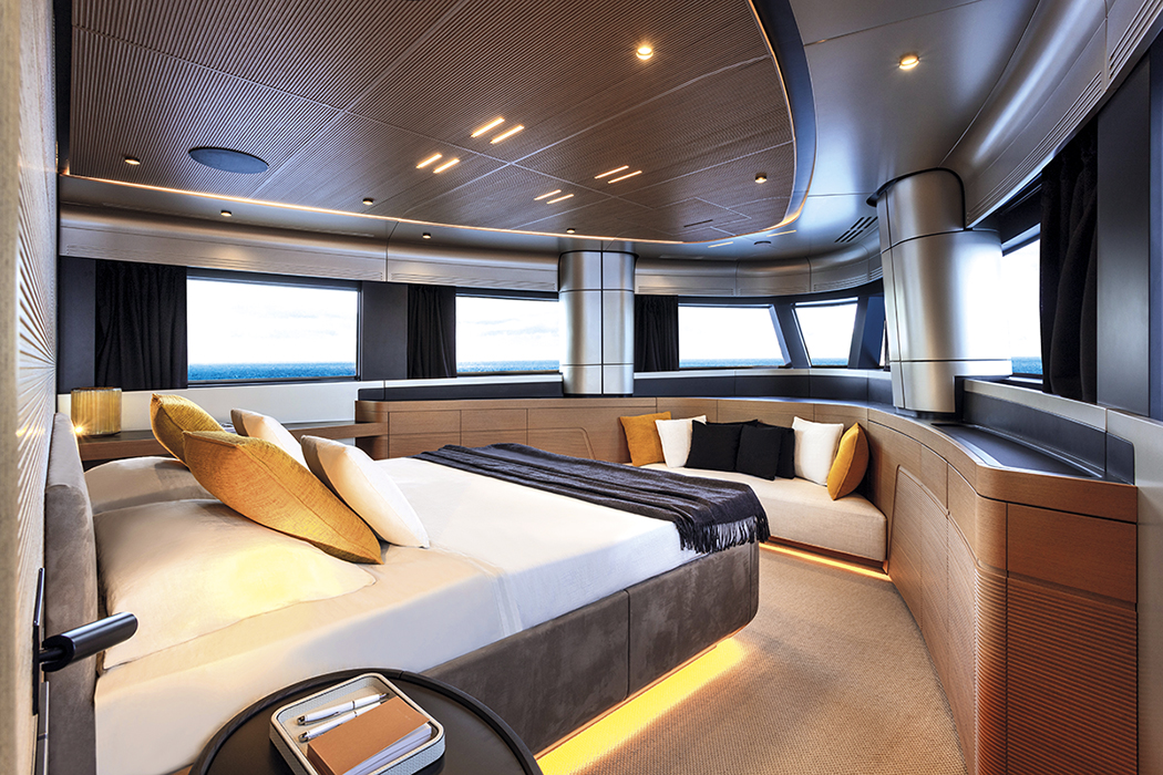 Una delle note dominanti – e anche elemento di forte innovazione – del wallywhy 150 che abbiamo testato nelle acque antistanti Porto Rotondo riguarda la superficie delle aree esterne. Tutto il ponte superiore è completamente aperto e modulato in modo da avere aree diverse per pranzare, prendere il sole, o vivere lo spazio conviviale all’ombra del T-Top. Sullo stesso piano è stata collocata la plancia di comando, protetta in una pilot house ai lati della quale i passavanti conducono nella zona prodiera tecnica, dedicata alle attrezzature per l’ancoraggio. Il ponte principale è un’altra area di estremo interesse per la portata innovativa che lo caratterizza, a partire dalla cabina armatoriale. È stata definita un “anfiteatro del mare” e ne ha, in effetti, tutte le caratteristiche. Collocata nella zona prodiera, quindi in posizione molto elevata, è circondata da finestrature che offrono una visione sul mare a 270 gradi.