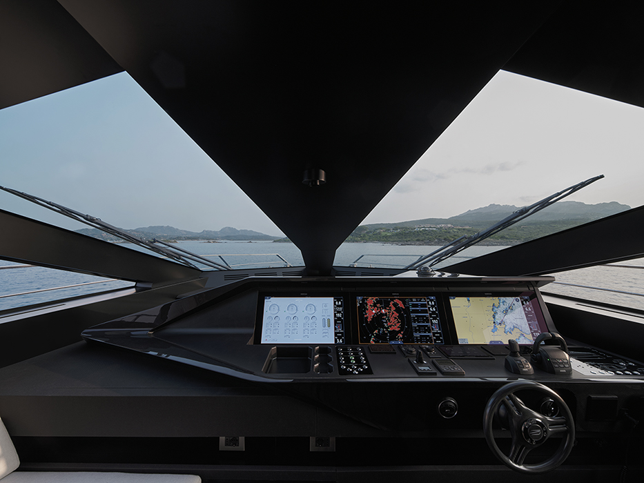 Ma è a 1300 giri che, a nostro avviso, si coglie il punto di forza e l’essenza del carattere di questo yacht in navigazione: in perfetto assetto dislocante, a 10 nodi, con consumi che crollano a 100 litri l’ora, si naviga letteralmente immersi nel comfort. Prima di sbarcare, il test vira sul ludico. Macchine ferme al largo di Porto Rotondo, il pretesto di testare gli effetti dello stabilizzatore giroscopico ci obbliga a una sosta per il pranzo seduti all’ombra del T-Top sul flybridge. Fregula ottima, rollio assente. Il Seakeeper svolge perfettamente il suo compito neutralizzando una dispettosa onda da Nord.
