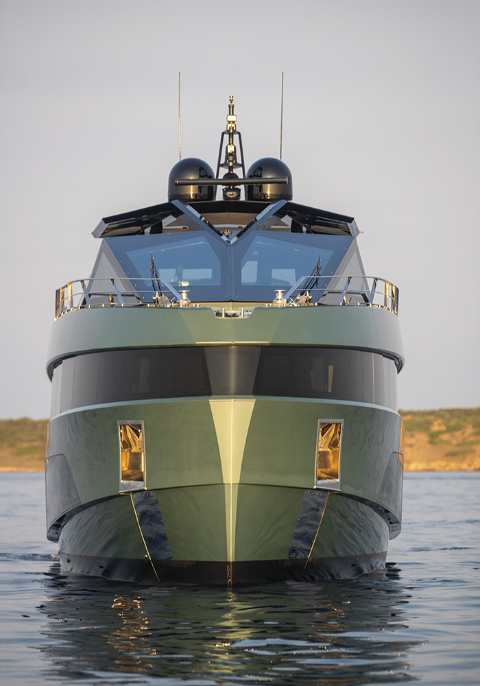 Che si tratti di un Wally lo si capisce a prima vista. Seppure in un percorso di continua evoluzione, le caratteristiche linee sportive hanno accomunato in modo deciso tutta la produzione del marchio, fondato ormai 30 anni fa da Luca Bassani, dando vita a una forte identità mantenuta anche dopo l’ingresso nella galassia Ferretti.