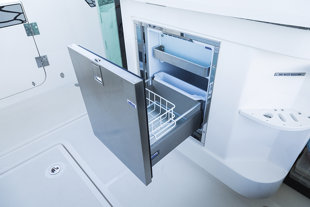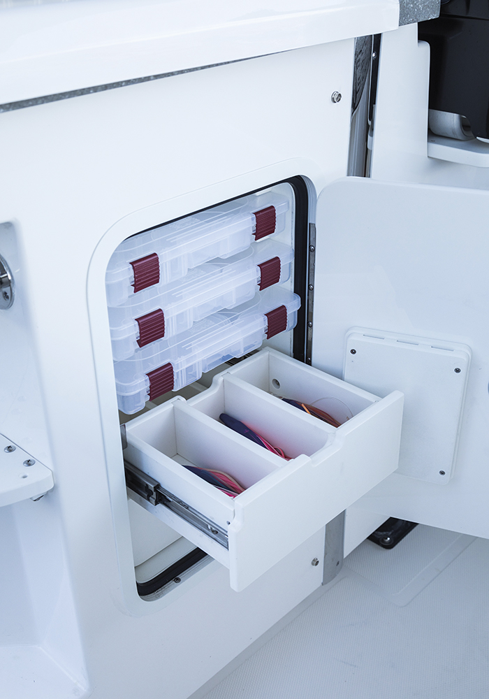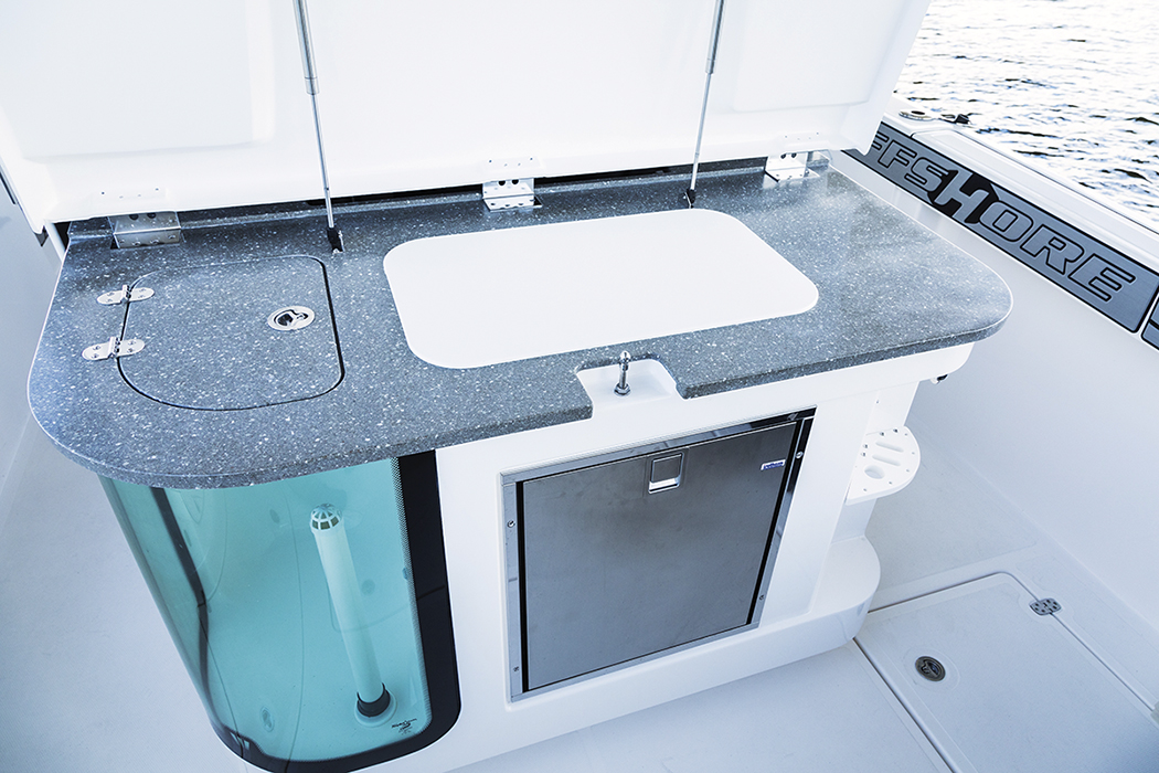 In pozzetto troviamo due vasche per il pescato a poppa, mentre quella per le esche è a ridosso della seduta del pilota. Qui è stata collocata anche la cucina che deve condividere il piano di appoggio con quello per la preparazione delle esche.