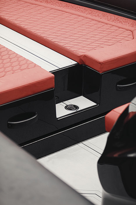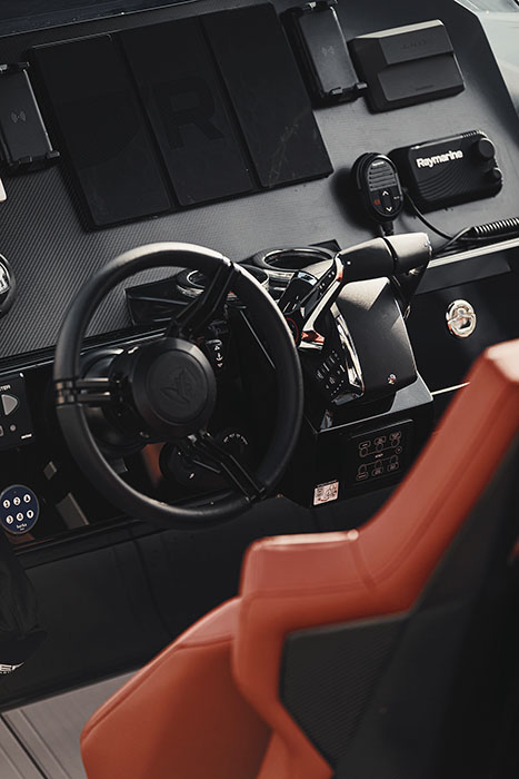 Dotazioni standard: 3x 12” Raymarine MFD – JL Audio 4x Speaker, 1x sub, 1x Amp – VHF Raymarine – Caricabatterie cellulare Wireless & Waterproof – Bow Thruster – Volante Gussi