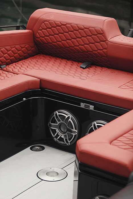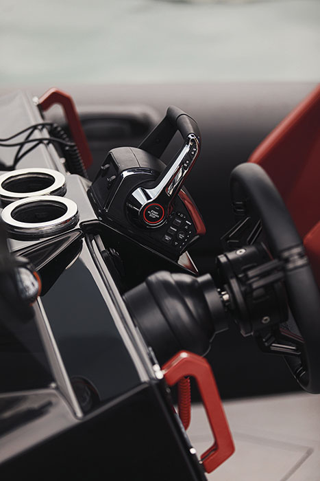 Dotazioni standard: 1x 12” Raymarine MFD – JL Audio 4x Speaker, 1x sub, 1x Amp – VHF Raymarine – 1x Caricabatterie cellulare Wireless & Waterproof – Bow Thruster – Volante Gussi.